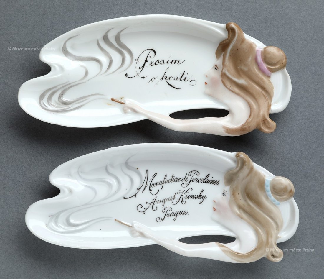 Odkládací misky na rybí kosti, kolem 1900, glazovaný, malovaný porcelán, š. 17,2 cm, vyrobeno v radlické porcelánce, značeno AUGUST KIOWSKY PRAGUE, sbírka MMP, inv. čísla H 127 698 a H 086 757