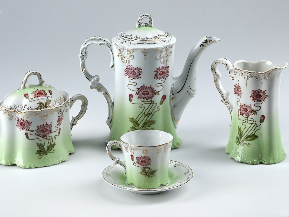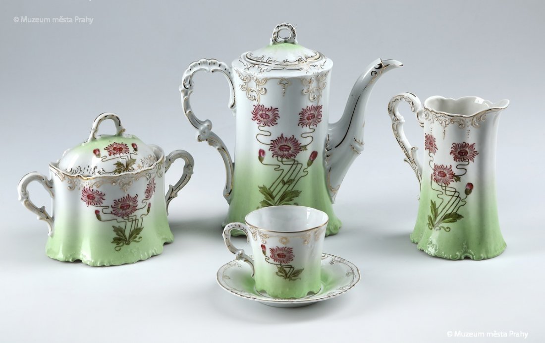 Část nápojového servisu, kolem 1900, glazovaný porcelán s potiskem, zlacený, max. v. 19 cm, vyrobeno v radlické porcelánce, značka výrobce AUGUST KIOWSKY PRAGUE, sbírka MMP, inv. číslo H 086 754/001-007