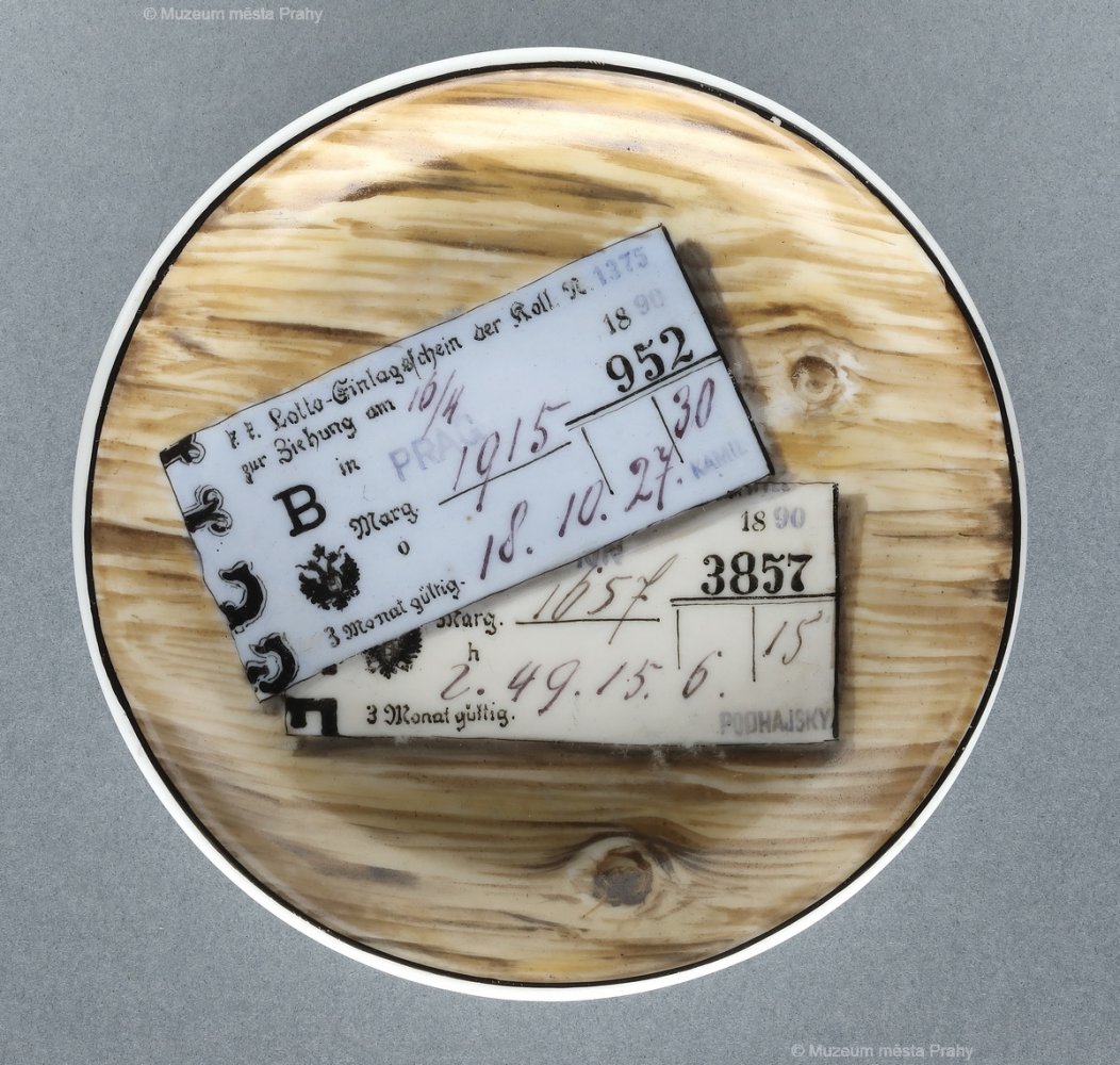 Talířek imitující dřevěnou misku s osobními železničními jízdenkami zvanými risconta směrem na Prahu, 1890, glazovaný, malovaný porcelán, průměr 13,6 cm, vyrobeno ve smíchovské porcelánce, značka výrobce Prag Smichov, sbírka MMP, inv. číslo H 027 764