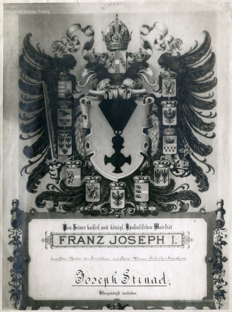 Diplom byl udělen vrchnímu malíři smíchovské porcelánky Josefu Strnadovi. Originál, který se nacházel v soukromém majetku dnes neznámé osoby, je nezvěstný. Muzeum města Prahy vlastní alespoň tuto starou dokumentační fotografii.