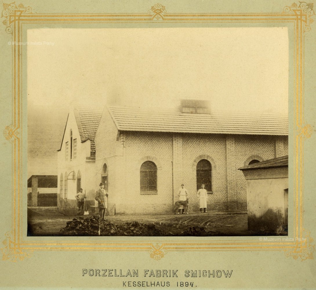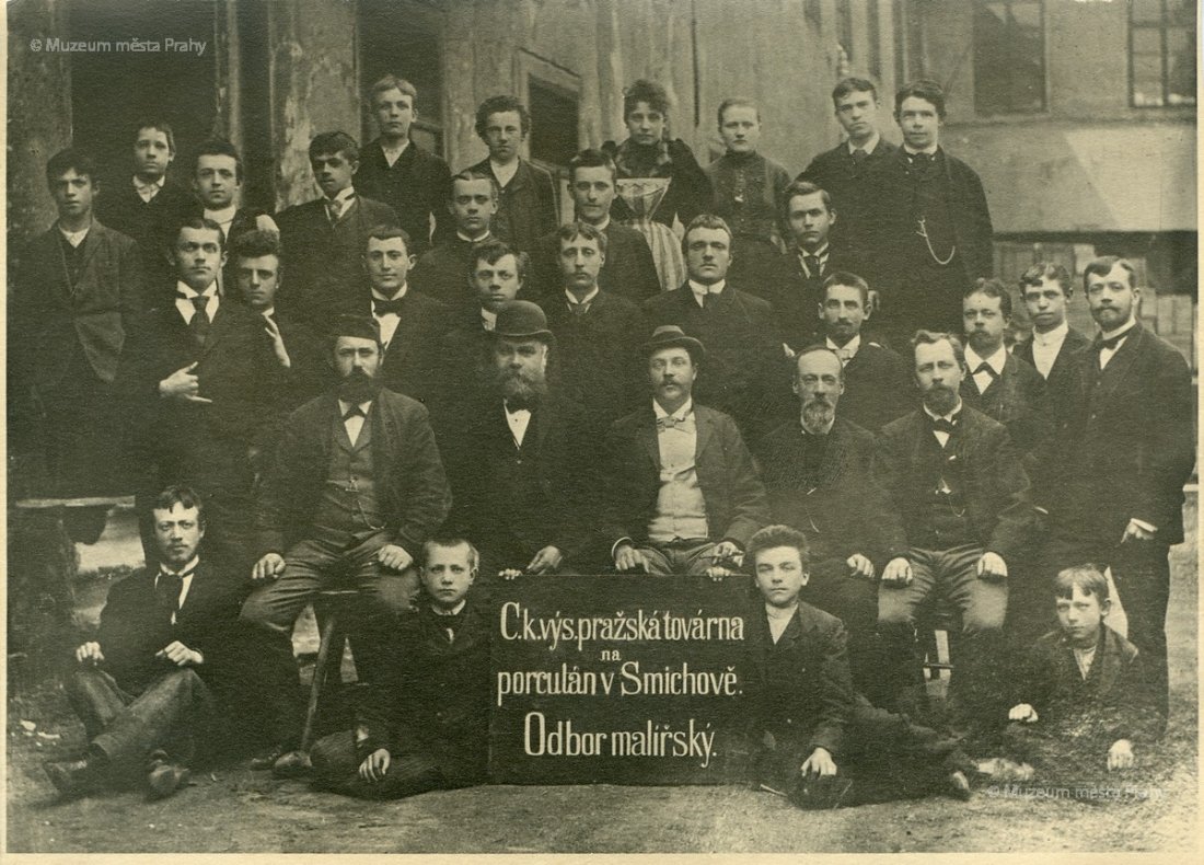 Tato skupinová fotografie bezpochyby vznikla na dvoře smíchovské porcelánky. Nápis na ceduli praví: C. K. výs. Pražská továrna na porculán v Smíchově. Odbor malířský. Pozornost zasluhuje, že se mezi mistry malíři, jejich pomocníky a učedníky nachází minimum žen, s nimiž si v pozdější době běžně spojujeme tuto vysoce řemeslně specializovanou, jemnou práci vykonávanou v porcelánkách.