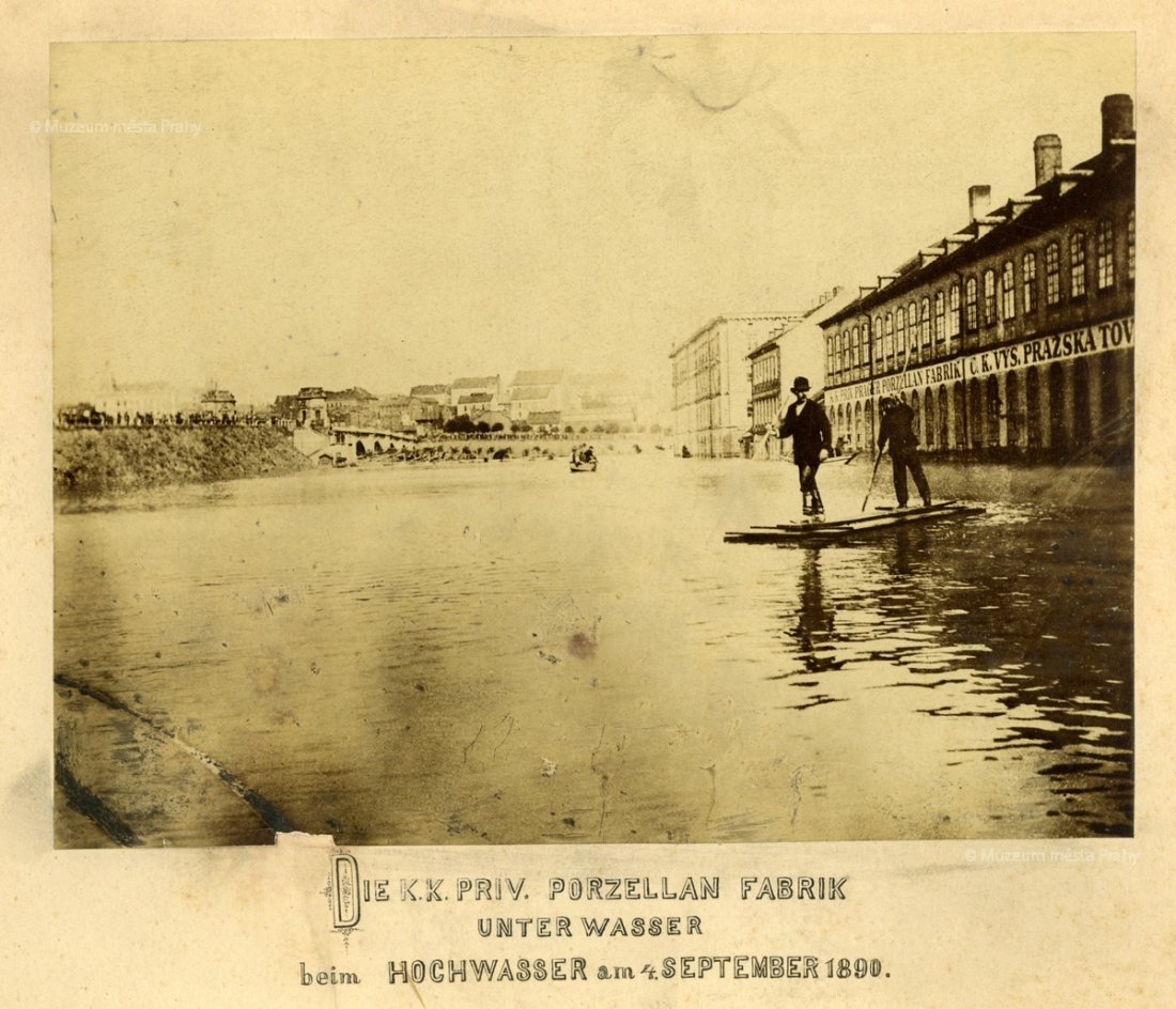 Fotografie smíchovské porcelánky za povodně, 4. září 1890, 17 × 22,7 cm, sbírka MMP, inv. číslo H 033 793