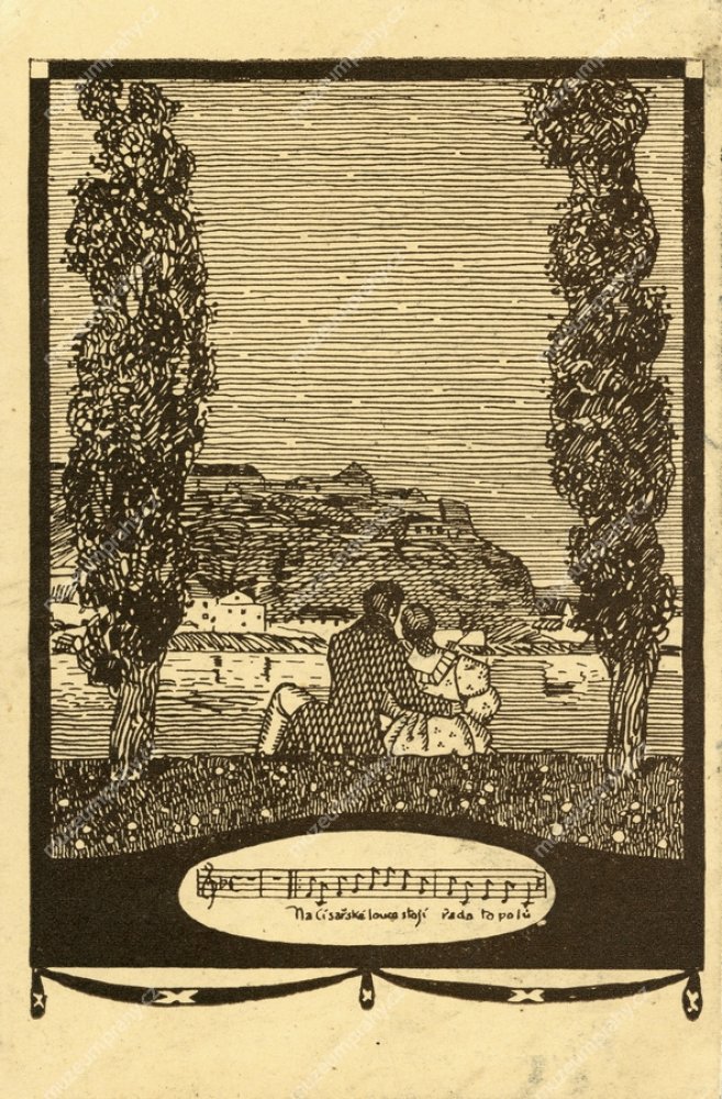 Romantická pohlednice Císařské louky podle kresby Josefa Weniga se začátkem písně Karla Hašlera. Vydal nakladatel F. J. Jedlička, odesláno 9. 4. 1918., MMP H 326 461.