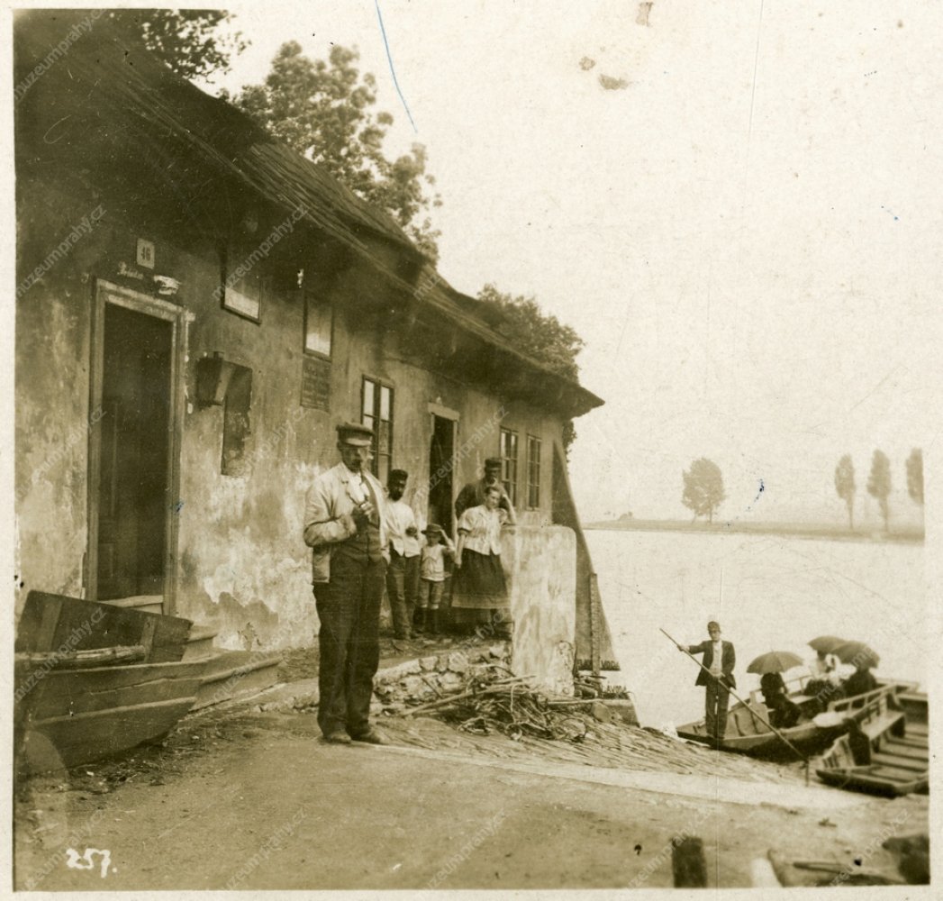 Převozníkův domek pod Vyšehradskou skálou. Vlevo stojí s dýmkou poslední vyšehradský převozník, o kterém víme, že se jmenoval Šebesta a zemřel 23. 8. 1923 ve věku 78 let. Vpravo v pozadí se právě chystá odplout loďka se třemi dámami „vyzbrojenými" slunečníky za účelem zachování běloskvoucí pleti (opálení se tehdy na rozdíl ode dneška neoceňovalo). Provoz obstarává již mladší převozníkův pomocník. Snímek z archivu Zikmunda Reacha, kolem r. 1900, MMP H216 626-001.