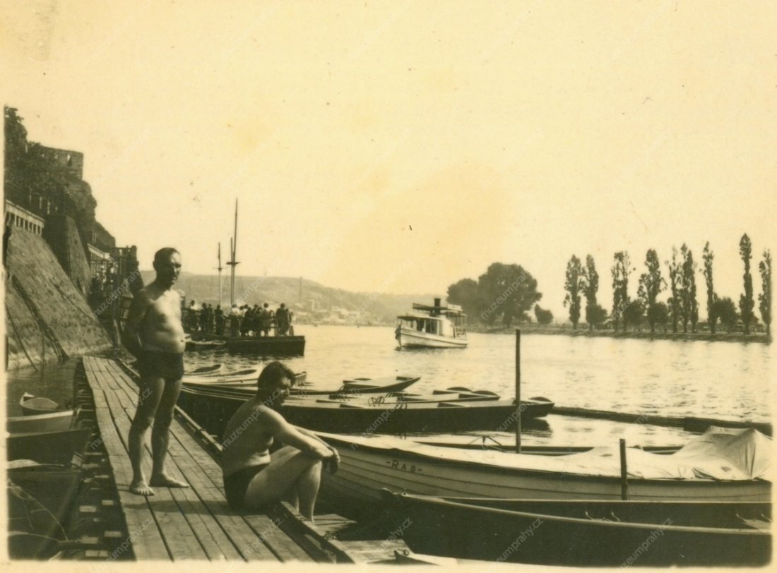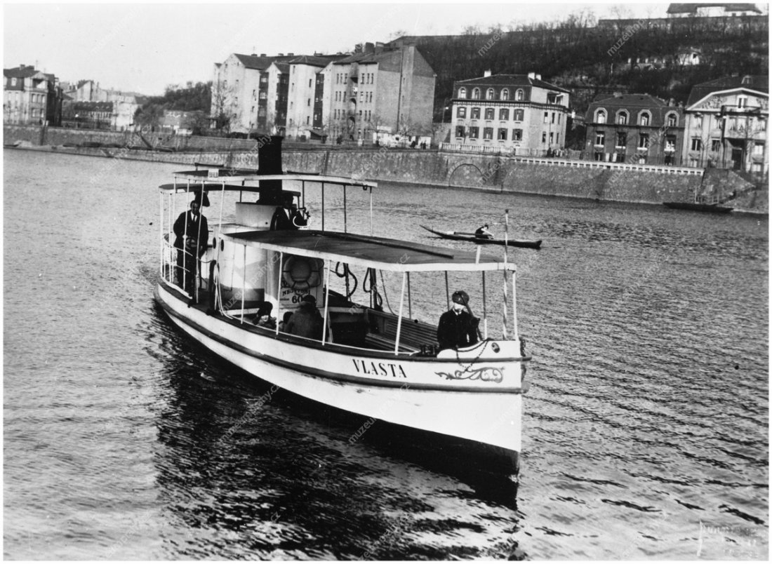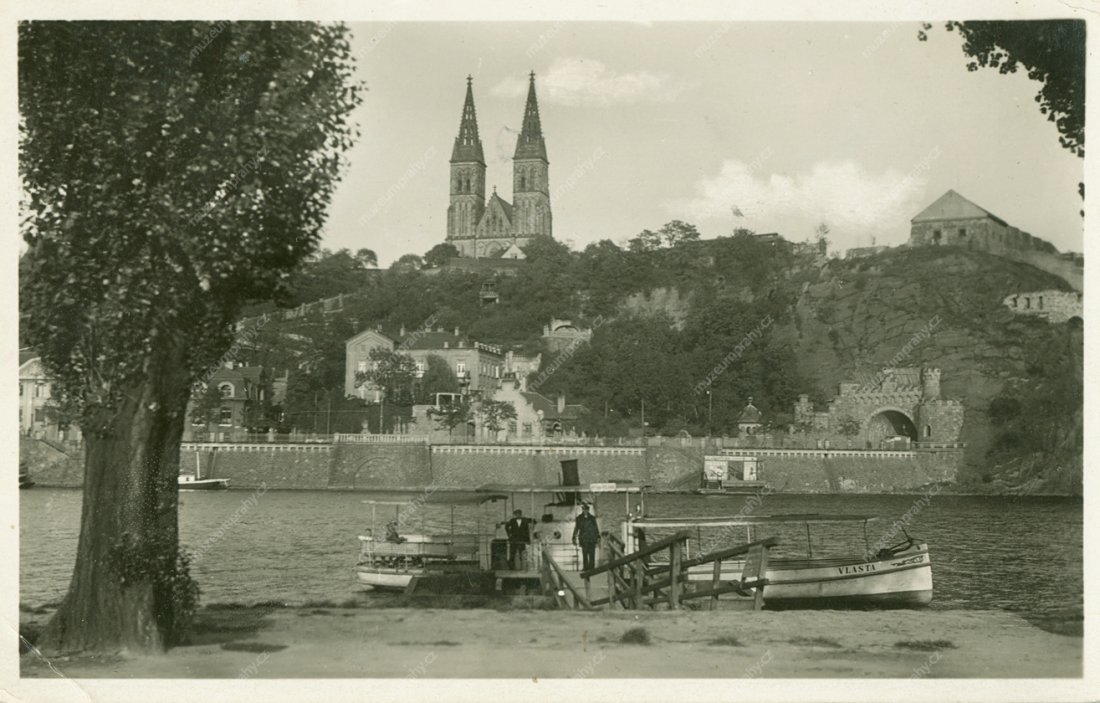Snímek z meziválečného období zachycuje přistávací manévr parníčku Vlasta u vyšehradského přístaviště. Po zahájení parního provozu musel být u schodiště z nábřeží zakotven dřevěný přístavní můstek, MMP H216 568; Parníček Vlasta koupila Pražská paroplavební společnost v r. 1912 v Německu. Byl nejmenší pražskou osobní lodí. Snímek byl pořízen brzy na jaře r. 1928, proto na palubě vidíme jen několik málo teple oblečených cestujících, MMP HNN 009 851.