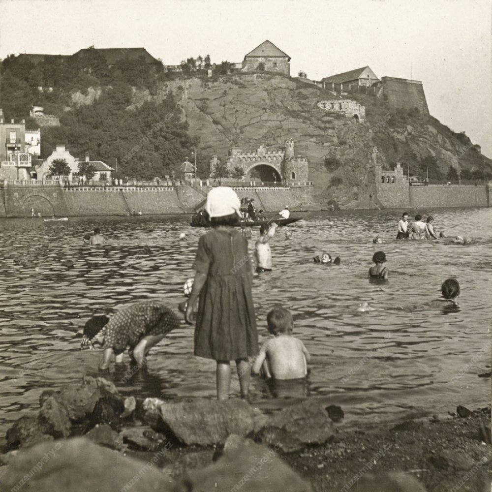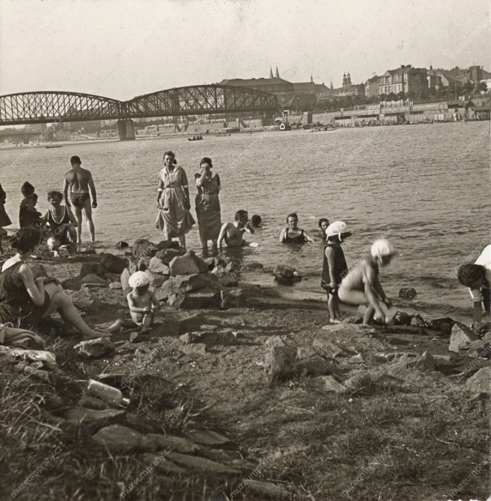 Skupina dětí a dospělých se koupe u Císařské louky. V pozadí Železniční most a jedna z mnoha plováren, které lemovaly pobřeží Vltavy. Snímek neznámého autora, kolem r. 1914, MMP H 336 982; Holčička na snímku přerušila hru a sleduje se zájmem přívoz (dosud s „ručním pohonem"), směřující od Vyšehradu k Císařské louce. Snímek neznámého autora, kolem r. 1914, MMP H 336 981.