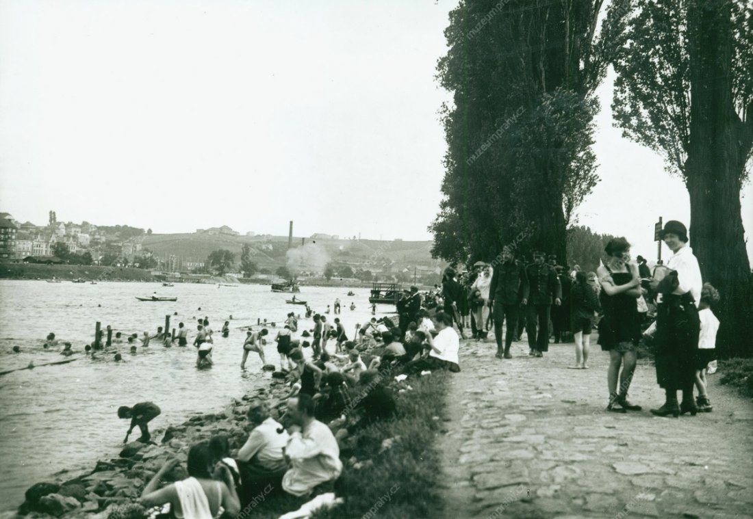 „Riviéra" na Císařské louce ve 20. letech 20. století Vidět je i dlážděná potahová stezka, která sloužívala koním, vlekoucím dřevěné nákladní lodě proti proudu. Fotografie neznámého autora, HNN 016 990.