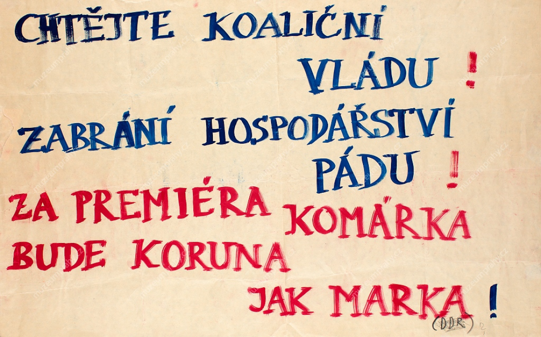 Chtějte koaliční vládu..., ručně malovaný červeným a modrým písmem, 900 x 560 mm