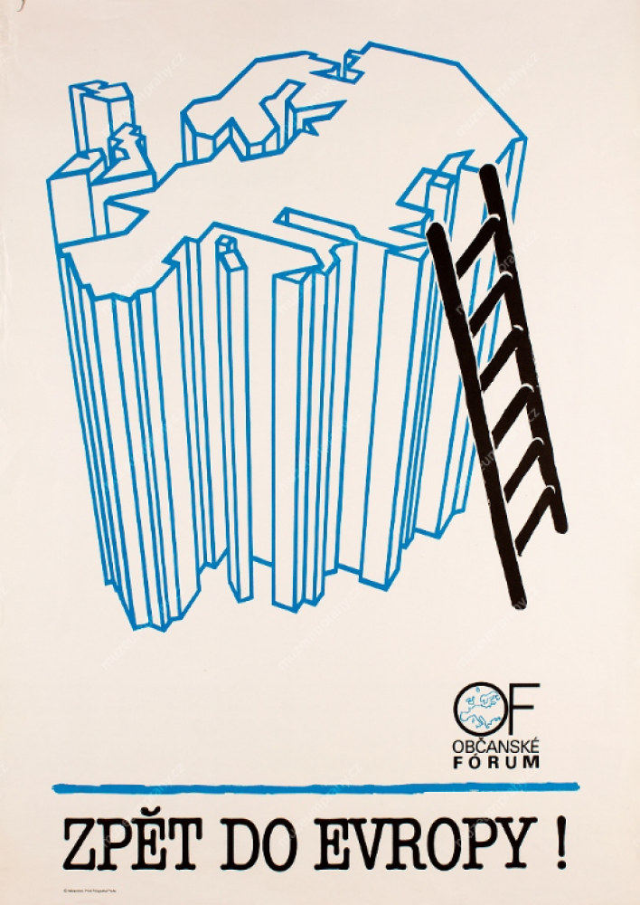 Plakát „Zpět do Evropy!" vyzývá k návratu z totalitní propasti zpět do evropského společenství svobodných demokratických národů. Požadavek demokracie, tolik akcentovaný na listopadových shromážděních a mítincích, byl chápán také jako návrat k západním kulturním tradicím předválečného masarykovského Československa. Polistopadová zahraniční politika našeho státu byla jednoznačně zaměřena na posilování vzájemných evropských vazeb. Česká republika vstoupila do Evropské unie dne 1. května 2004.