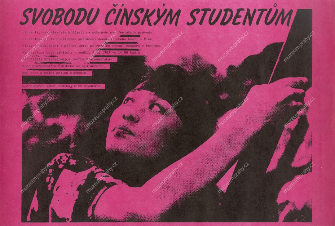 U příležitosti půlročního výročí masakru na náměstí Nebeského klidu v Pekingu uspořádali čeští studenti dne 3. 12. 1989 manifestační shromáždění před hlavní budovou Filozofické fakulty UK na tehdejším nám. Krasnoarmějců (dnešní Palachovo náměstí. Průvod studentů pak pokračoval až k čínskému velvyslanectví v Praze 6 ─ Bubenči, kde byla předána protestní petice.