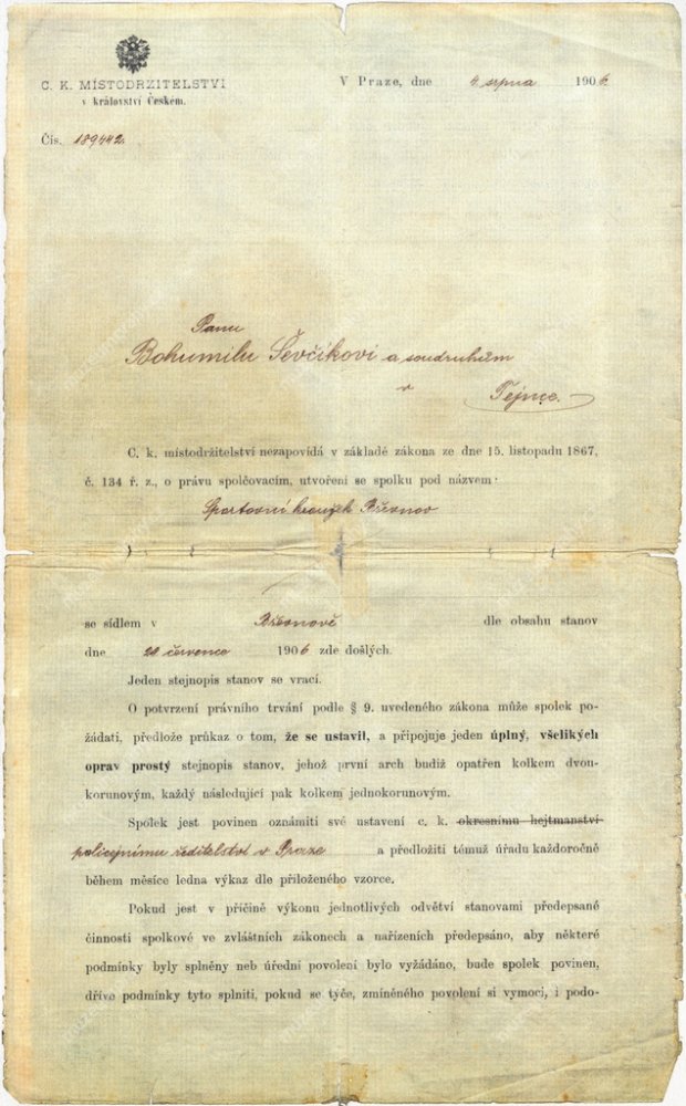 Místodržitelství povoluje, resp. nezapovídá založit spolek SK Břevnov, 4. srpna 1906, MMP H 327 239/005, 006.