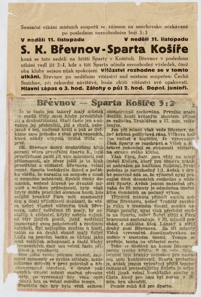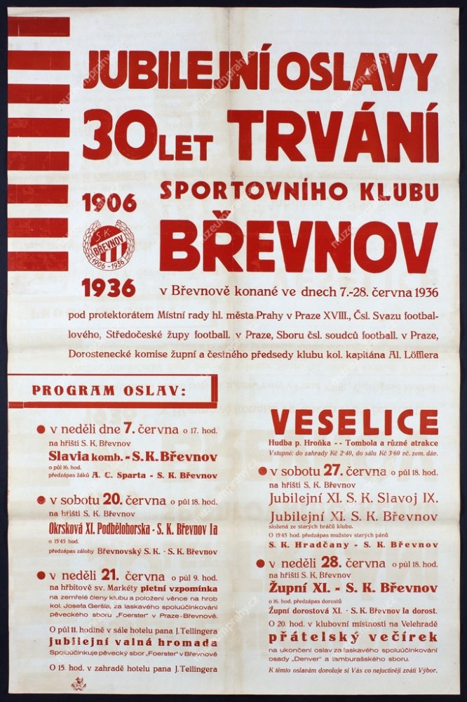 Zprávy z tisku z roku 1929, MMP H 327 239/003; Plakát jubilejní oslavy klubu SK Břevnov u příležitosti 30letého trvání, 1936, MMP HP 000 229, sbírka P. Šaura.