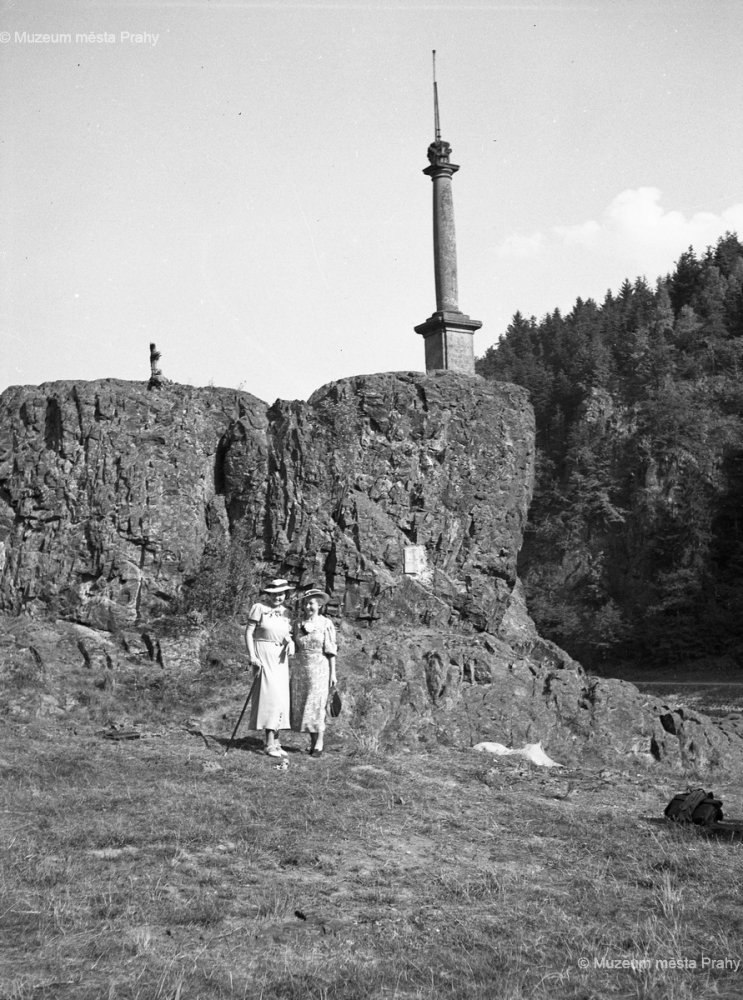Píše se rok 1937 a k Ferdinandovu sloupu právě dorazily dvě dámy v elegantních letních šatech s nezbytnými klobouky. Foto Jaromír Rokyta. Negativ, MMP HNN 014 026.