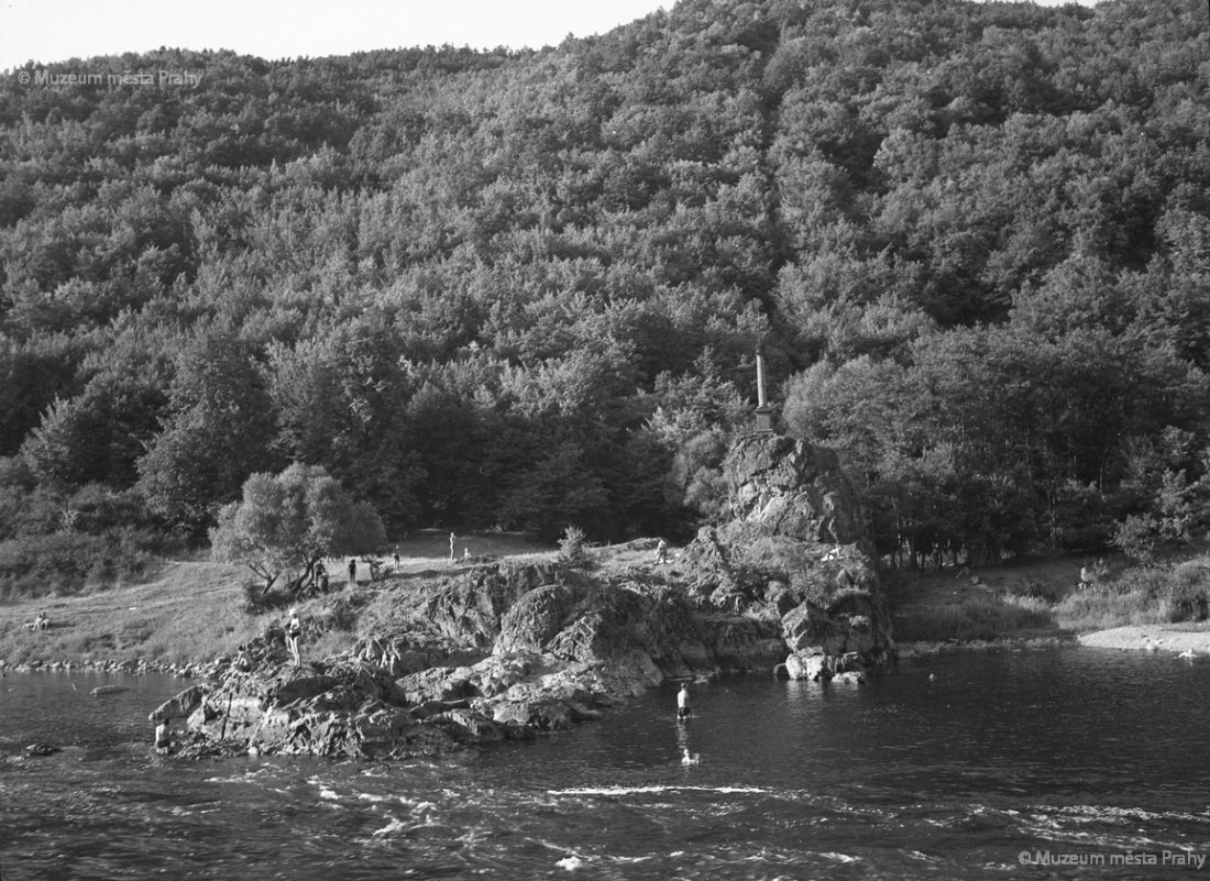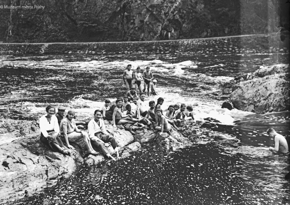 Celkový pohled na skálu Sedlou u Horního slapu s koupajícími se výletníky v r. 1937. Foto Jaromír Rokyta. Negativ, MMP HNN 014 127.