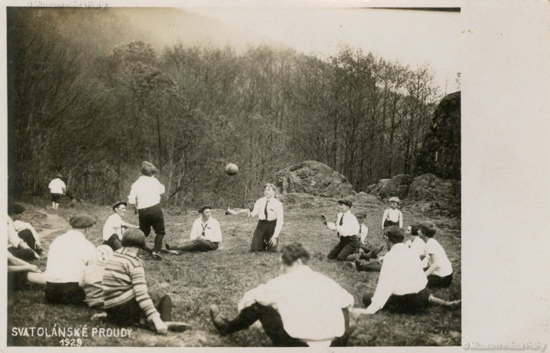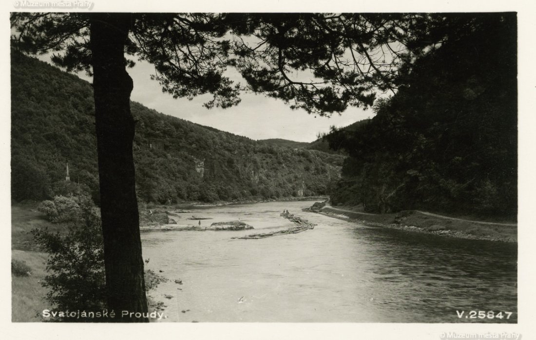 Výletníci si na jaře 1929 zahráli u skály Sedlo míčovou hru. Soukromá fotopohlednice, MMP H345 759; Vorový pramen proplouvá kolem Horního slapu Svatojánských proudů. Pohlednice z 30. let 20. stol. MMP H 216 570.