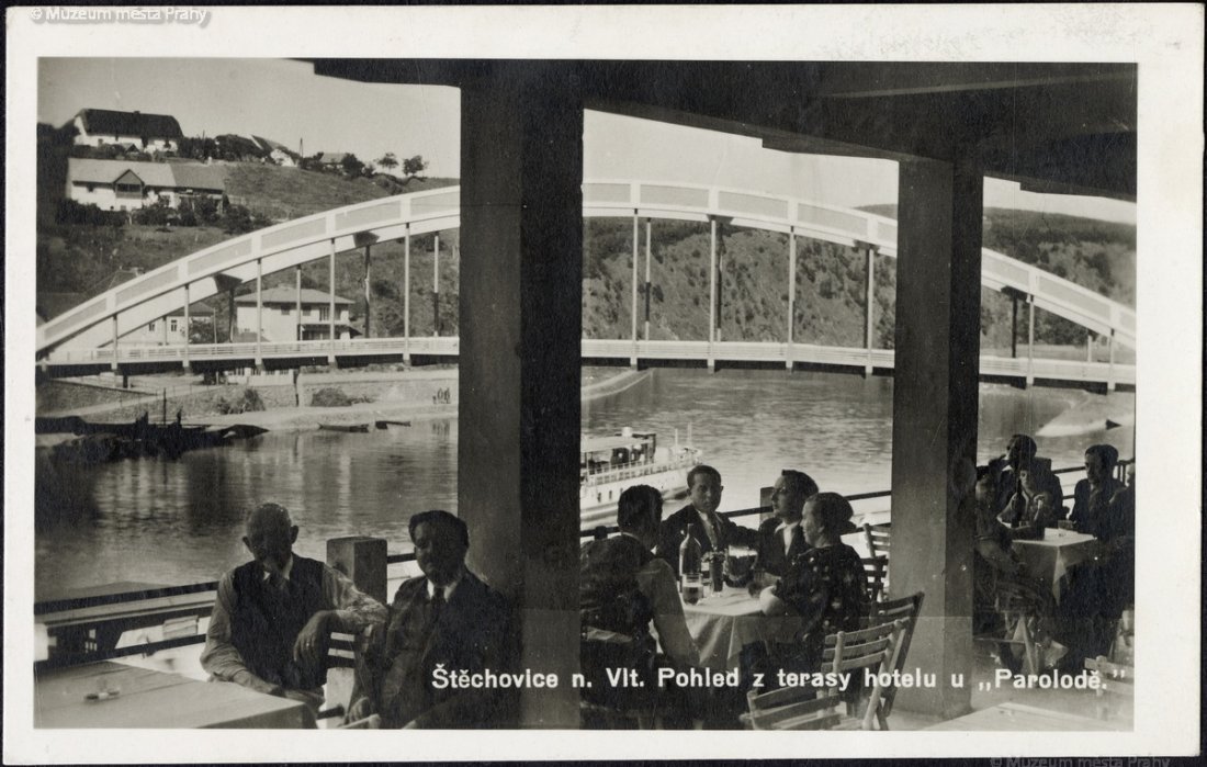 Pohoda na terase restaurace „U parolodi" s novým mostem v pozadí v r. 1939. Do vypuknutí války zbývá několik týdnů. Podle pamětníků bylo léto toho roku mimořádně slunečné a krásné, jako by se příroda loučila s obdobím míru. Pohlednice, MMP H 216 834.