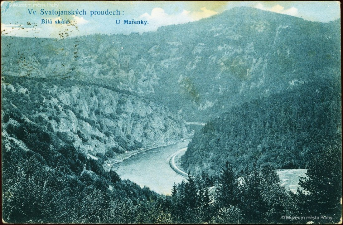 Pohled do divokého kaňonu Svatojánských proudů počátkem 20. století. Vlevo Bílá skála, ve které je dnes vysekána turistická stezka, v pozadí vpravo v pozadí vrch Máj s jednou z nejvyšších skalních stěn u nás. Pohlednice, MMP H 082 907.