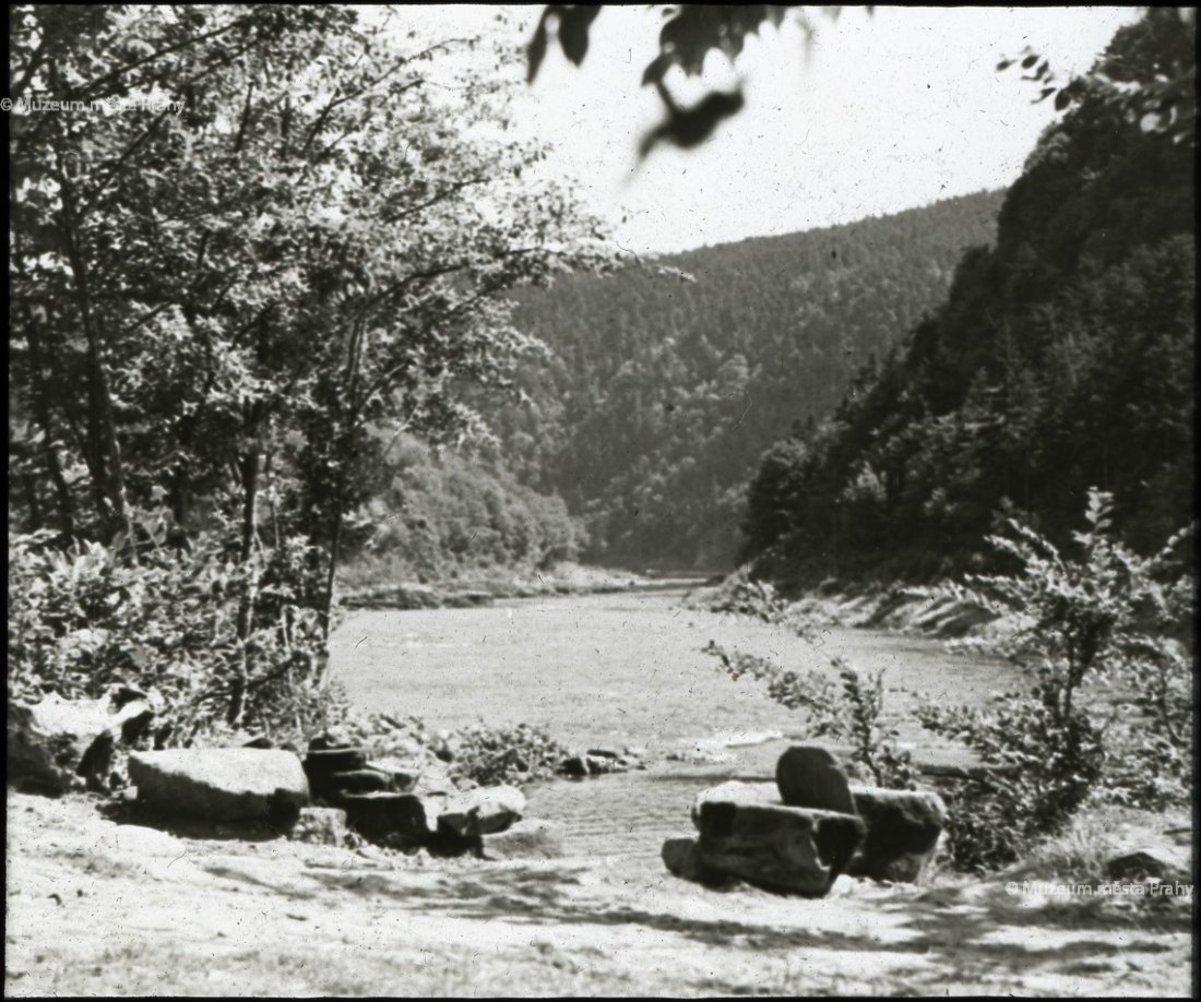 Tento snímek z horkého letního dne ve Svatojánských proudech jako by vyzýval ke koupeli. Šumění řeky je téměř slyšet. Diapozitiv neznámého autora, 30. léta 20. stol. MMP HND 007 825.