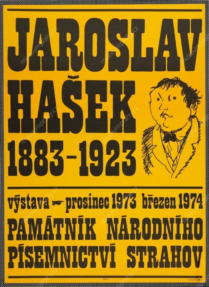 Plakát výstavy Jaroslav Hašek 1883–1923, Památník národního písemnictví v Praze, prosinec 1973 – březen 1974, autor plakátu Milan Kodejš, MMP H 92 471.
