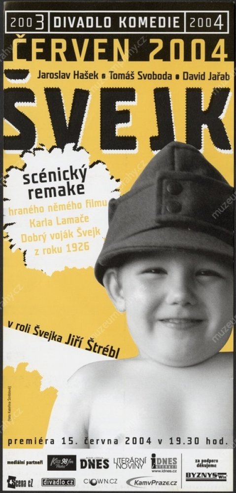 Plakát ke kabarietnímu představení Švejkiáda, režie P. Vašíček, Divadlo U věže, květen–červen 1987, MMP H 129 819; Program k divadelní hře Švejk scénického remaku filmu Dobrý voják Švejk z roku 1926, napsali Jaroslav Hašek, Tomáš Svoboda, David Jařab, Divadlo Komedie, premiéra 15. června 2004, foto plakátu Kateřina Štréblová, MMP H 278 346.