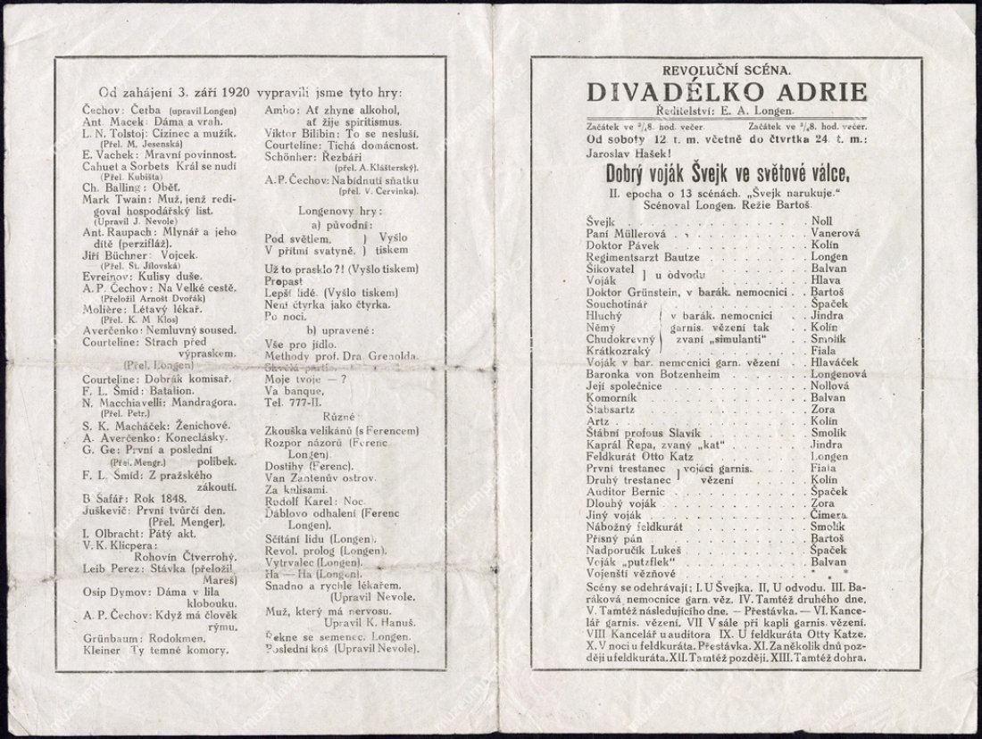 Program komedie Dobrý voják Švejk ve světové válce, v úpravě E. A. Longena, po roce 1920, Revoluční scéna Divadélka Adrie na Václavském náměstí, MMP H 75 117; Plakát k divadelní hře Švejk vyhrál bitvu, režie Bedřich Bozděch, 12. května 1923, Divadlo Adria, MMP H 134 311.