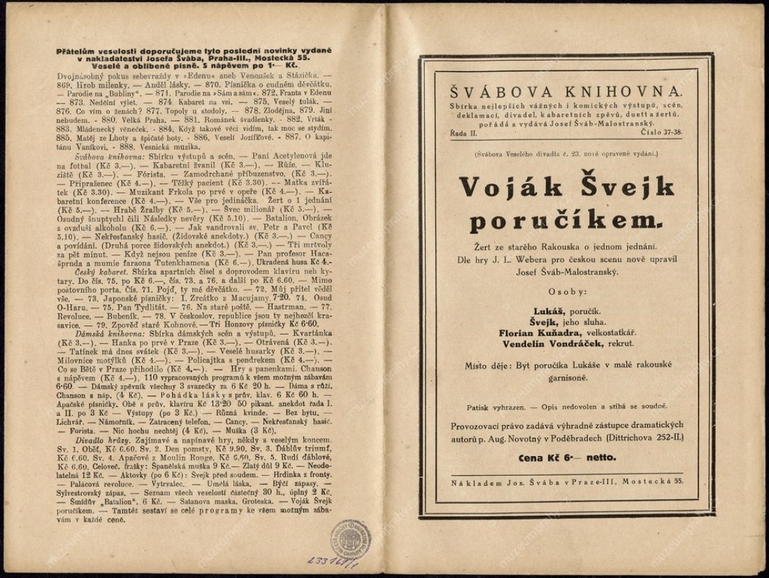Libreto ke hře Voják Švejk poručíkem, podle hry J. L. Webera upravil Josef Šváb-Malostranský, kolem roku 1925, Švábova knihovna – Sbírka komických výstupů, scén, deklamací a žertů, MMP H 233 161; Libreto ke hře Voják Švejk před vojenským soudem, napsal Jan Pik-Zbirovský, kolem roku 1925, Švábova knihovna – Sbírka komických výstupů, scén, deklamací a žertů, MMP H 246 108.