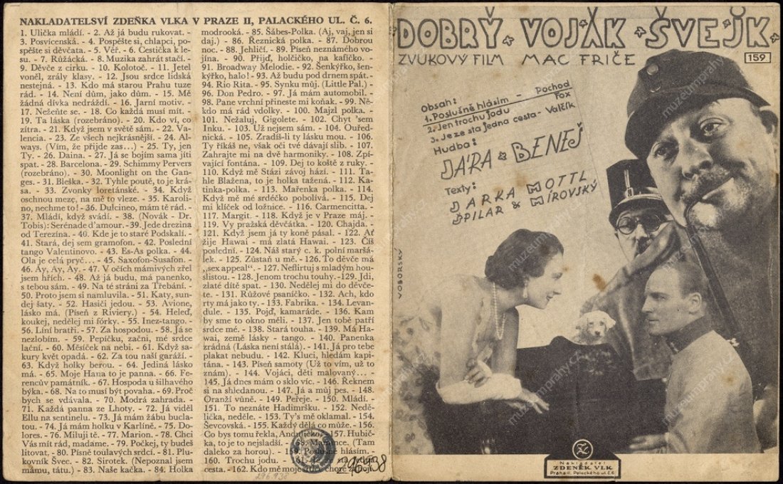 Píseň Poslušně hlásím z filmu Dobrý voják Švejk, hudba Jára Beneš, slova Jarka Mottl, Václav Špilar, Václav Mírovský, nakladatelství Zdeněk Vlk, Praha II, autor obálky Voborský, 1932, MMP H 296 938.