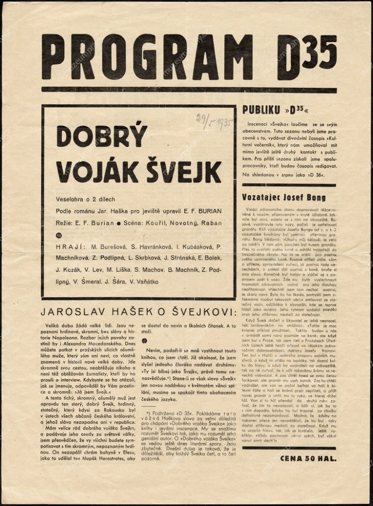 Program k divadelní hře Dobrý voják Švejk, režie E. F. Burian, Divadlo D 35, květen 1935, MMP H 75 115.