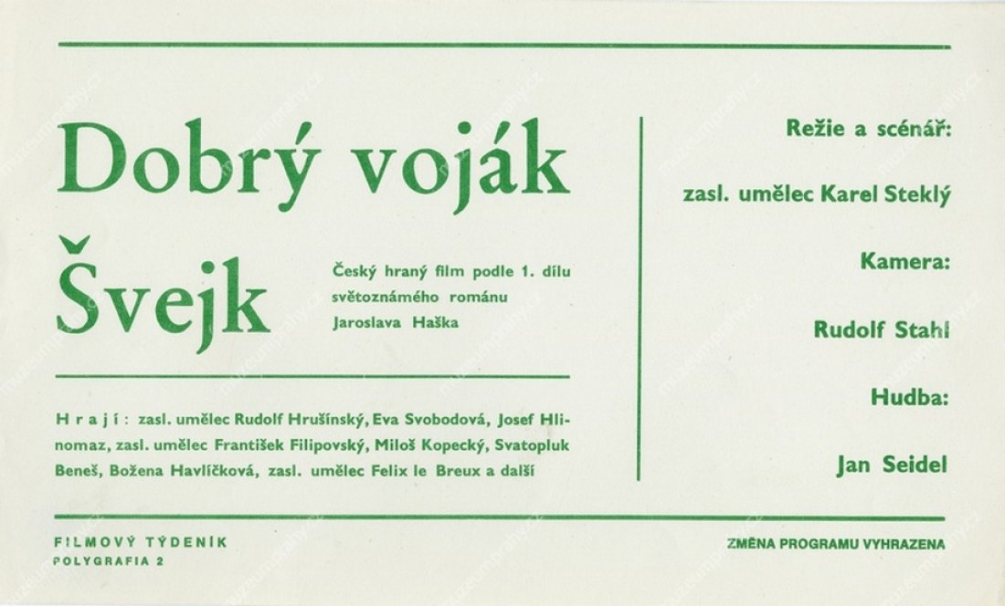 Leták k československému filmu Dobrý voják Švejk, režie Karel Steklý, MMP H 179 959.