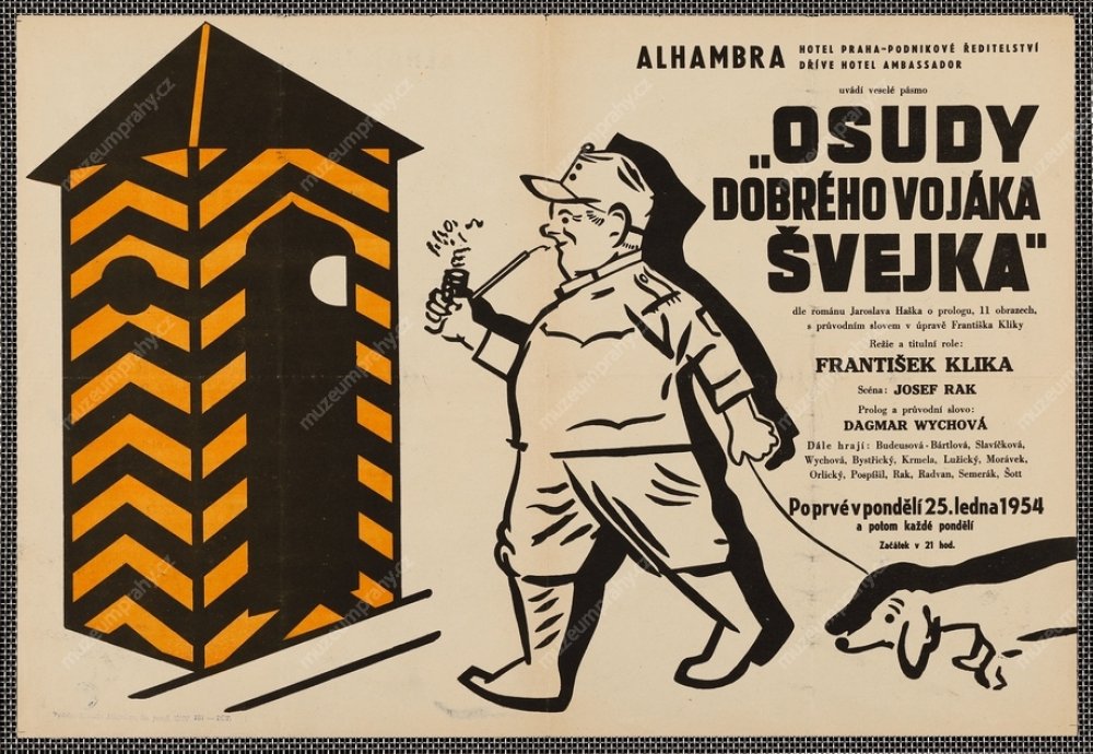 Plakát k představení Osudy dobrého vojáka Švejka, režie František Klika, Alhambra, 25. ledna 1954, MMP H 311 869.