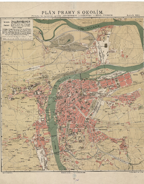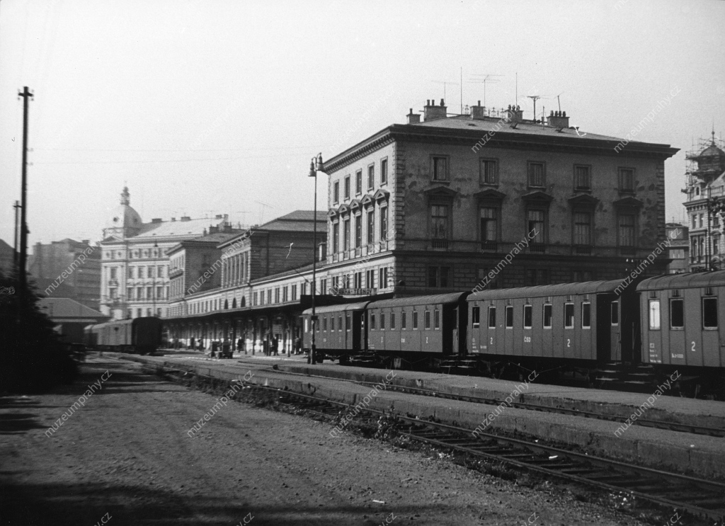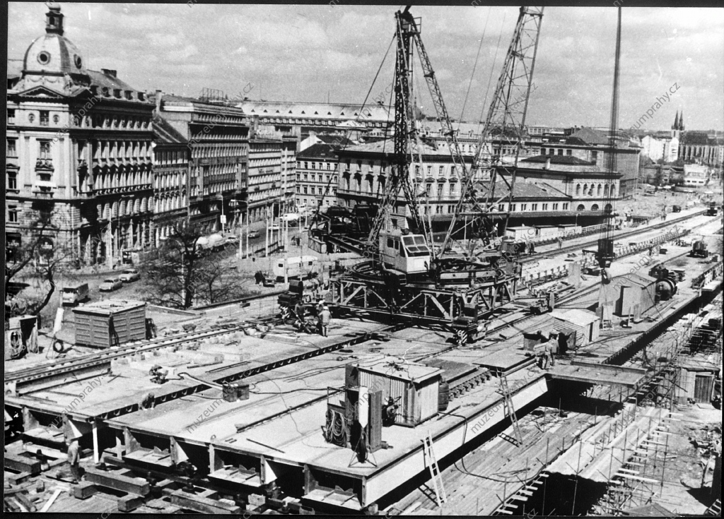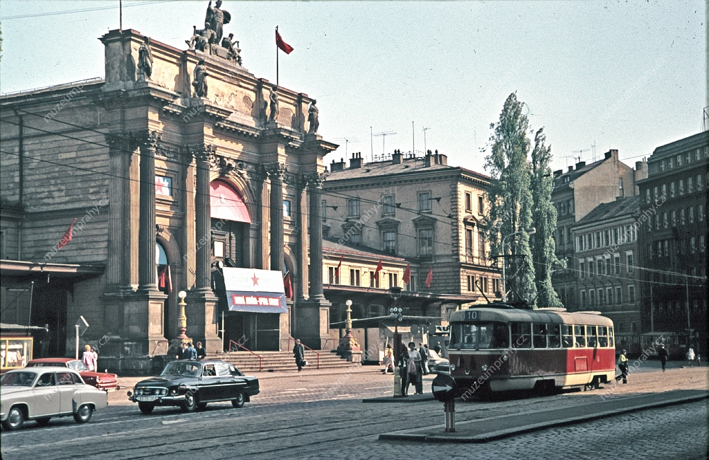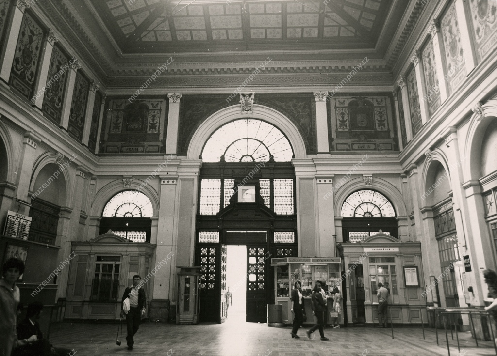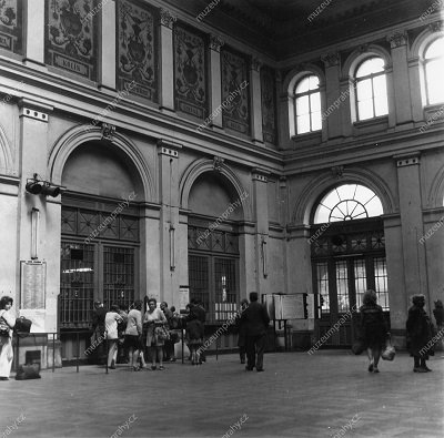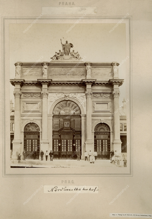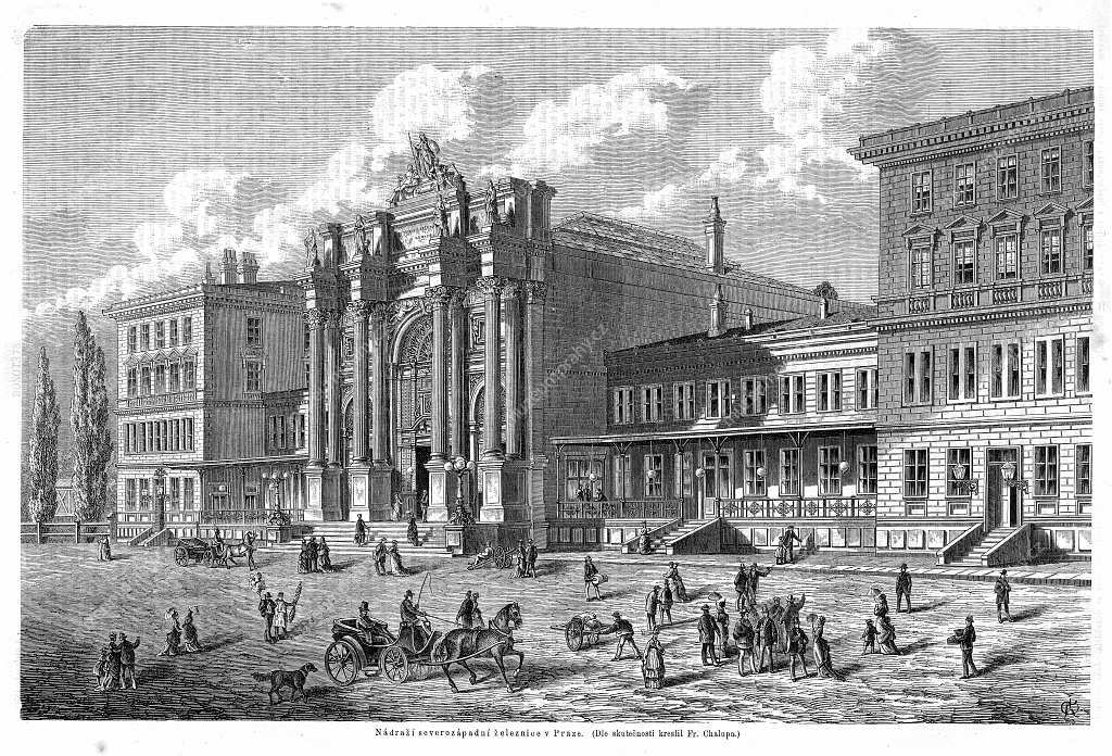 V květnu roku 1875 začalo v Praze fungovat nové nádraží. Nechala je vystavět významná železniční společnost Rakouská severozápadní dráha, která o dva roky dříve propojila svou rozsáhlou síť železničních tratí s Prahou. Novorenesanční budova navržená architektem Karlem Schlimpem v podobě vskutku velkorysé, byla roku 1876 v časopise Světozor výstižně charakterizována: „Vůbec jest budova stavbou velkolepou, k účelům svým dobře příhodnou a slouží Praze k nemalé okrase". Vznosnou architekturou vynikala zejména ústřední část nádražní budovy, jejíž průčelí bylo pojato jako klasický vítězný oblouk se čtyřmi sloupy, na nichž byly umístěny sochy znázorňující obchod, vědu, průmysl a hospodářství. V nejvyšší části se nacházelo sousoší zobrazující průmysl a rolnictví, nad nimž se vypínala Austrie jako jejich ochránkyně. Stejně honosně byly pojaty i vnitřní prostory odbavovací dvorany, což opět dokládá časopis Světozor: „Vůkol jsou znaky hlavnějších stanic dráhy severozápadní, a sice hned nad vchodem znak Prahy a Vídně, po obou stranách Znojma, Jihlavy, Německého Brodu, Kutné Hory, Kolína, Litoměřic, Ústí nad Labem, Děčína, Trutnova, Hostinného, Mladé Boleslavi, Jičína, Králové Hradce, Chlumce, Nymburka a Lysé. U znaků měst českých jsou nápisy české, u německých německé, jen města Lysou a Nymburk anektovali pro němectví a napsali tam nápisy po Německu. Znaky jsou vkusně malovány. Dále nalézá se ve vestibule veliká mapa zemí rakouských a německých a zemí pohraničných. Čekárna pro I. a II. třídu jest zařízena velmi elegantně; sedadla jsou potažena zeleným aksamitem, stoly jsou mramorové. Na stropě nalézají se skvostné arabesky. Také restaurace a čekárny III. a IV. třídy jsou slušně zařízeny" (Světozor, rok 1876, č. 44, s. 591).