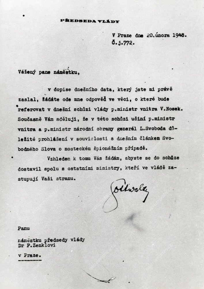 Dopis Klementa Gottwalda Petru Zenklovi, kterým předseda vlády odpovídá na ministrův dopis a zve jej na schůzi vlády. Reprodukce textu, 20. 2.1948. MMP H 198.576; Reprodukce dokumentu demise ministrů Petra Zenkla, Huberta Ripky, Jaroslava Stránského a Prokopa Drtiny adresovaná prezidentu Edvardu Benešovi. Reprodukce textu, 20. 2. 1948. MMP H 198 577.