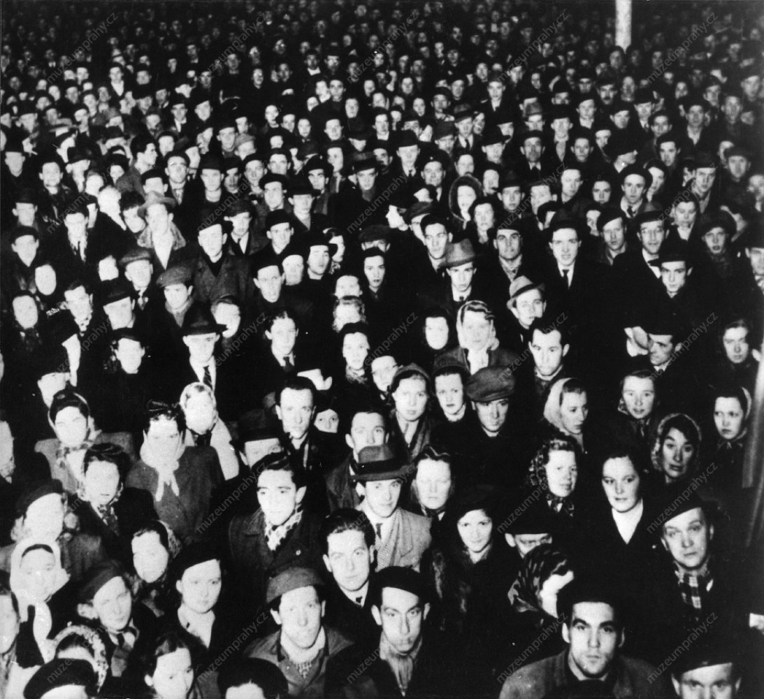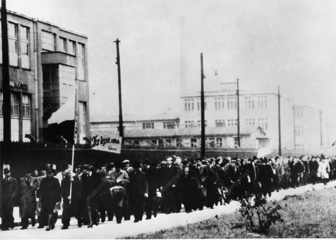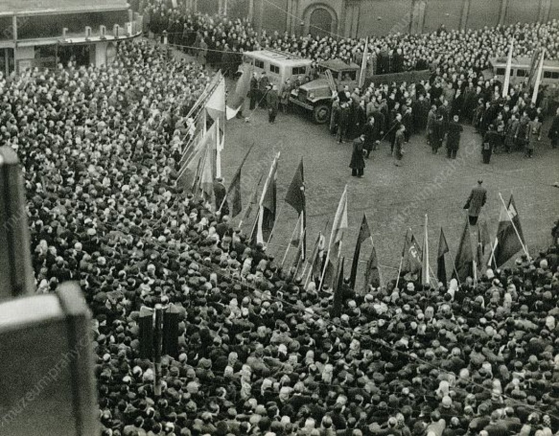 Zaměstnanci podniku Aero Letňany odcházejí v dopoledních hodinách na manifestaci na Staroměstském náměstí, kde promluvil předseda vlády Klement Gottwald. 21. února 1948, MMP H 198.578; Vybrané momentky průvodů směřujících na Staroměstské náměstí. 21. února 1948, MMP H 044.098/010 a H 200.247/003.