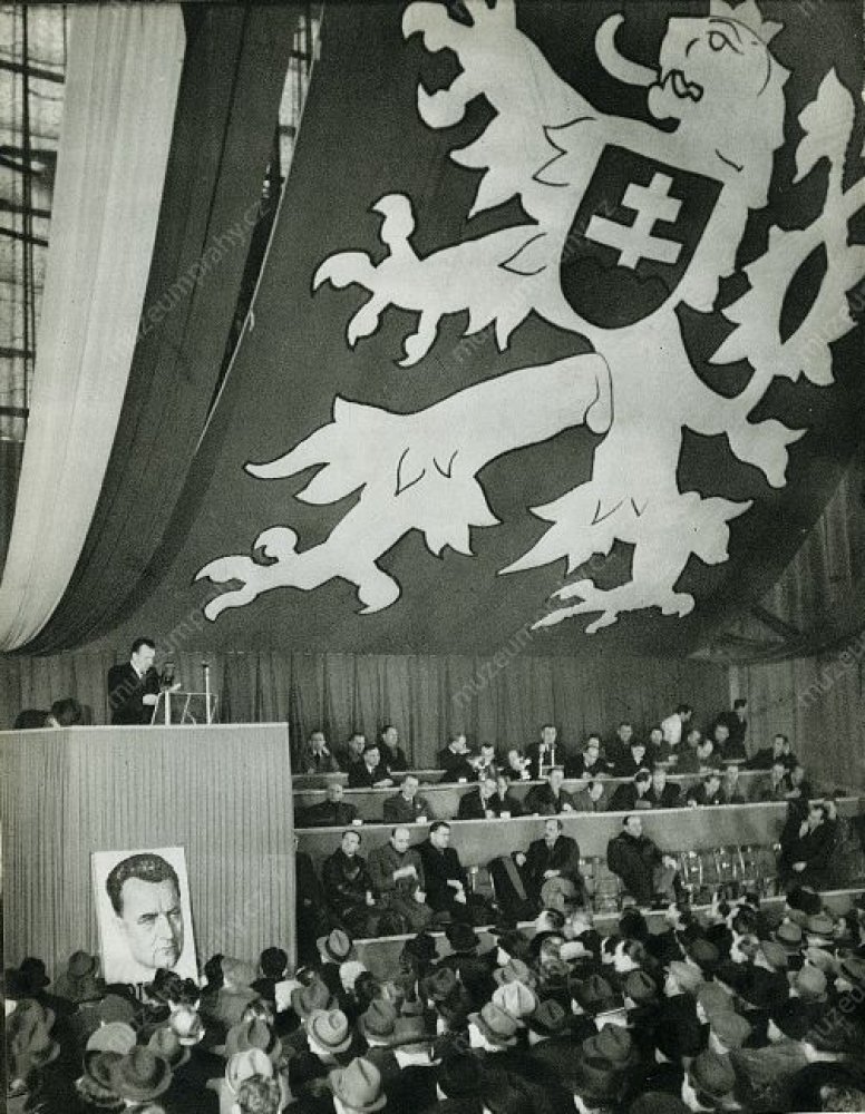 Sjezd závodních rad v Průmyslovém paláci v Praze. Sněm se vyjadřuje k vnitropolitické situaci. Záběr na hlavní tribunu při projevu Antonína Zápotockého, poslance a předsedy Ústřední rady odborů. 22. února 1948, MMP HNS 000 263/060.