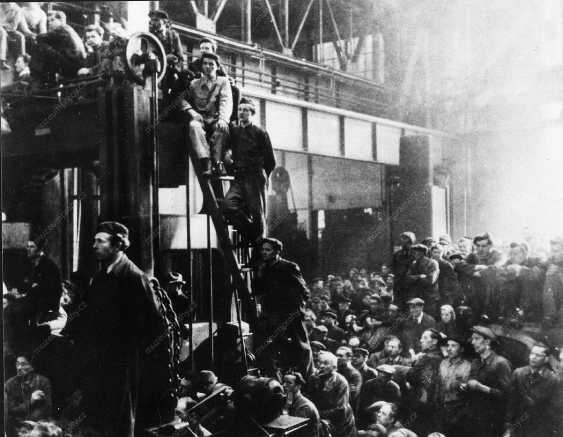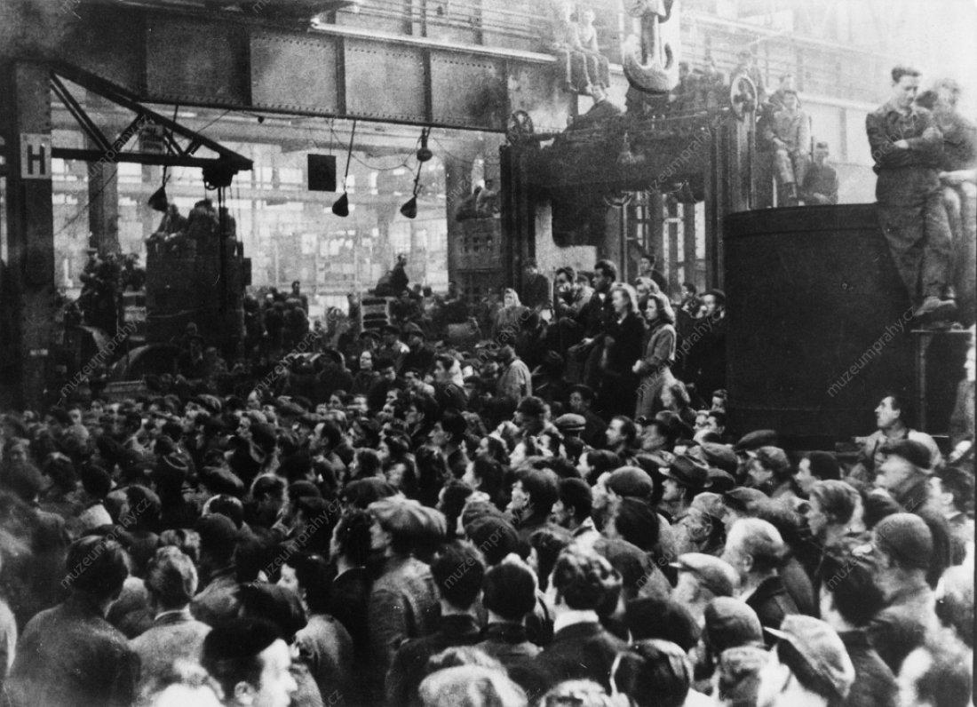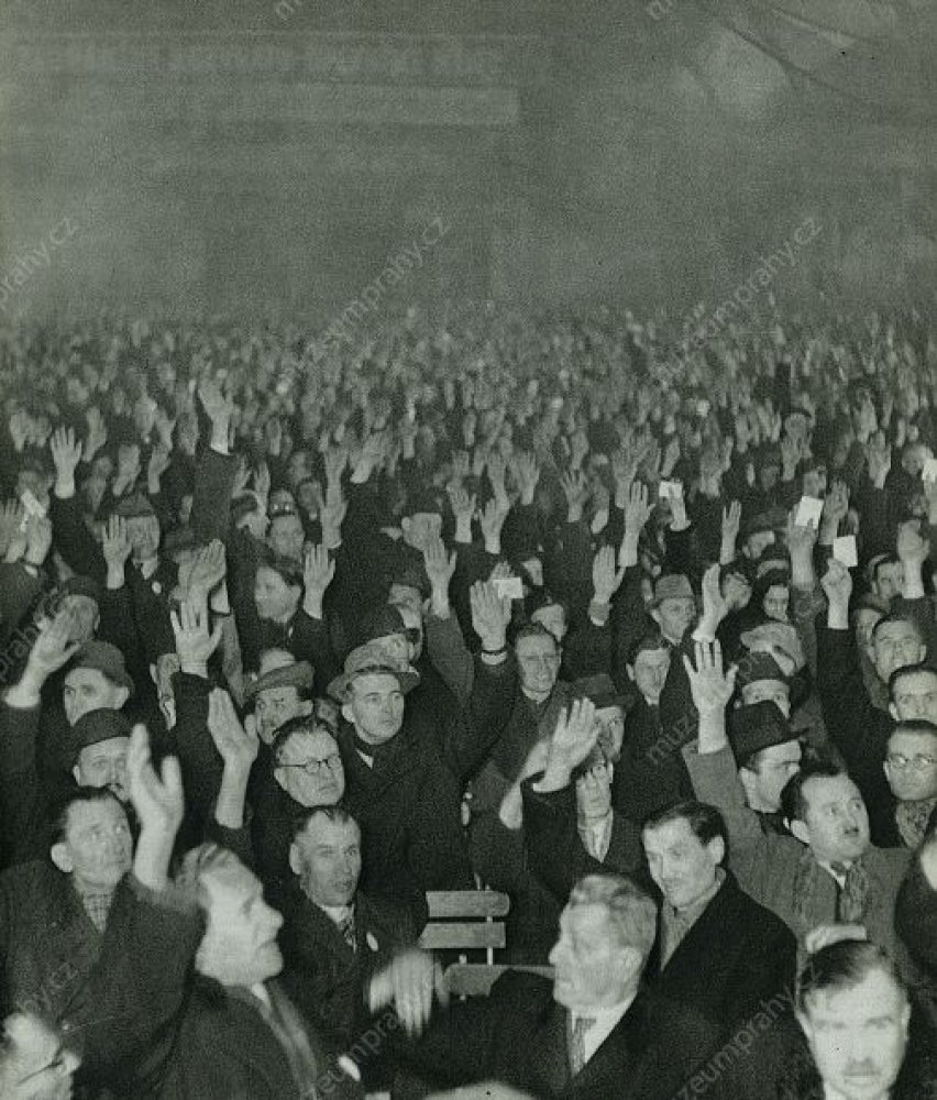 Dělníci jsou informováni o usnesení celostátního sjezdu závodních rad. Pohled na shromáždění zaměstnanců národního podniku Tatra Smíchov, MMP HNS 000 264/060; Aktuální politické dění a jeho ohlas v Rudém právu. 23. února 1948, MMP HNS 000 921/061.