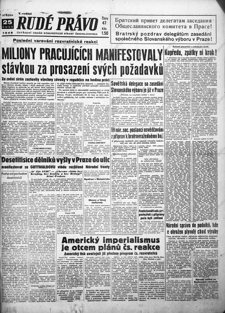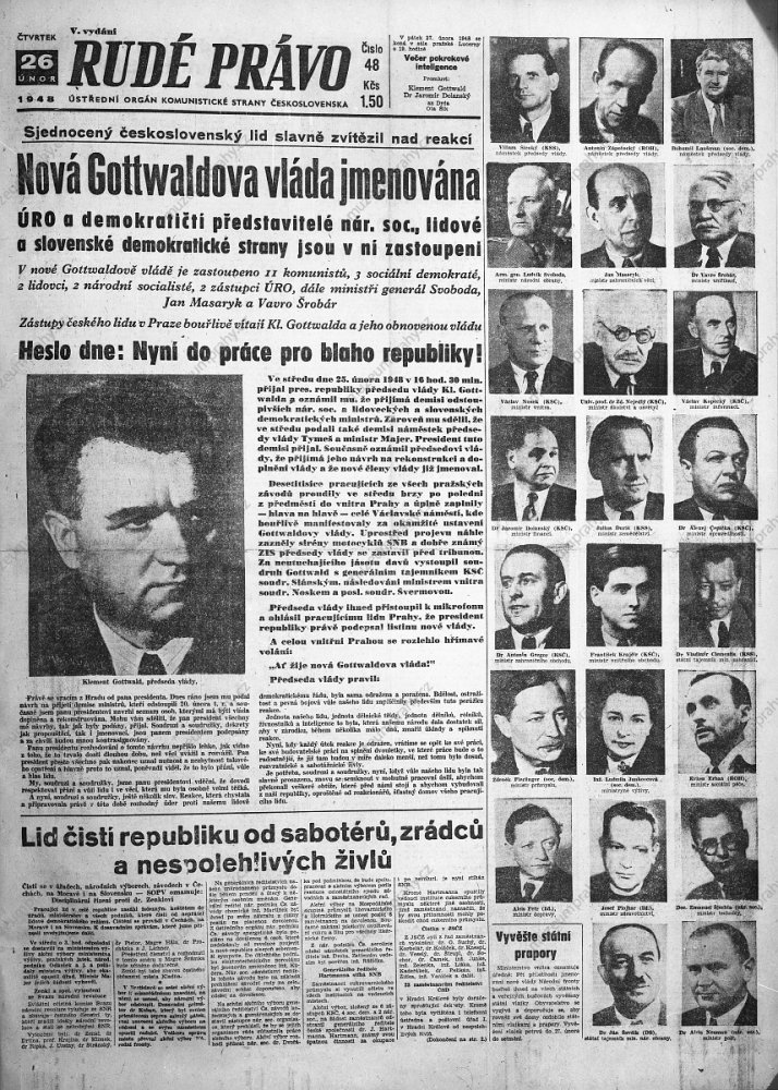 Takto výstižně charakterizuje poslední kolo mocenského boje v Československu na sklonku února 1948 jeden z titulků propagačních plakátů výtvarníka Jiřího Kodejše, odkazující k 25. výročí tzv. Vítězného února. Ten představuje jeden z významných momentů československých dějin, který předznamenal jejich průběh v celé druhé polovině 20. století. Okolnosti vyvolání tohoto státního převratu v Československu je nutné chápat v kontextu poválečných politických změn, k nimž došlo v důsledku zapojení Československa do sféry vlivu tehdejšího Sovětského svazu a při enormním nárůstu členské základny Komunistické strany Československa. Populistický program, podpořený společenskými agitacemi a prosovětským poválečným patosem, přinesl první úspěch již ve volbách do národních výborů v květnu 1946, když komunisté získali největší zastoupení v nově zvolených místních národních výborech (komunisté – 108 členů, národní socialisté – 92, sociální demokraté – 89, lidovci – 54, bez stranické příslušnosti – 23).