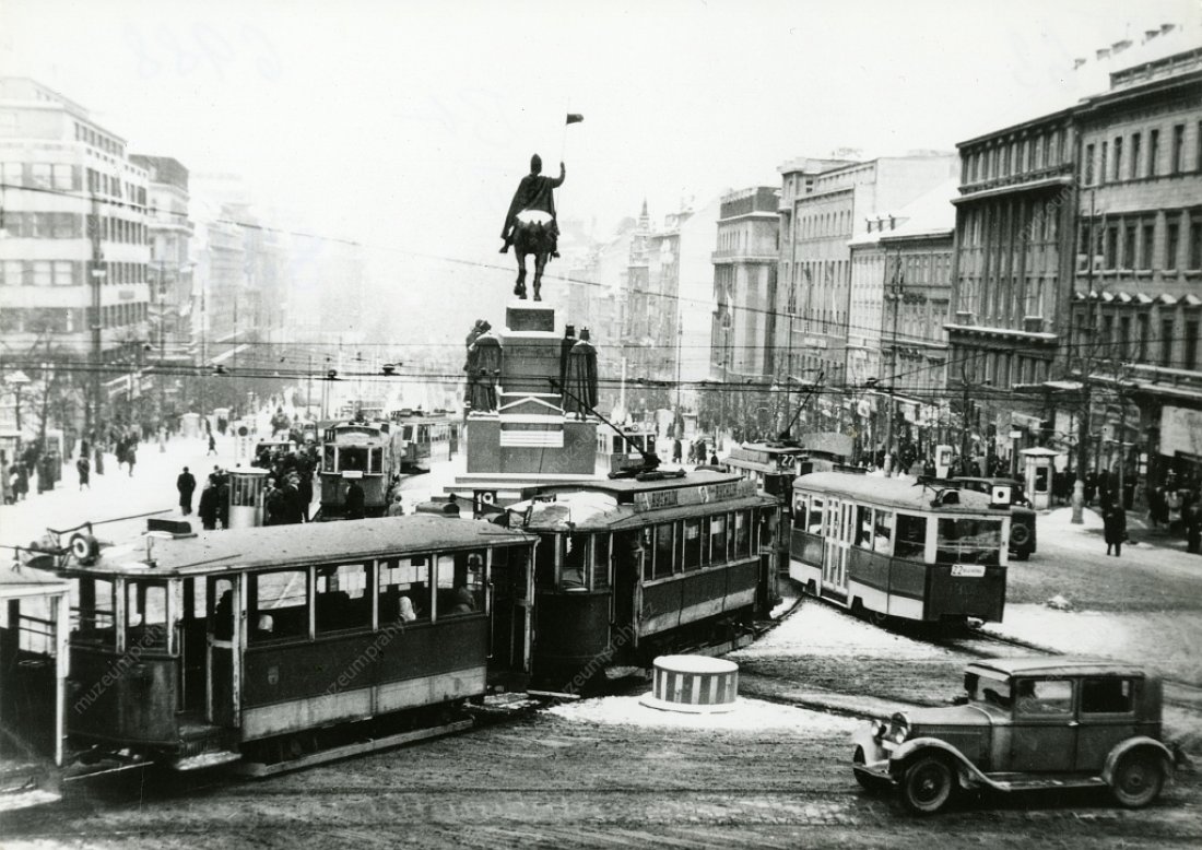Titulní stránka Rudého práva ze dne 25. února 1948. Informace o konání celorepublikové generální stávce předchozí den, MMP HNS 000 102/061; Václavské náměstí v poledne 24. února 1948. Z důvodu nástupu generální stávky je na hodinu zastavena doprava, MMP H 119 546.