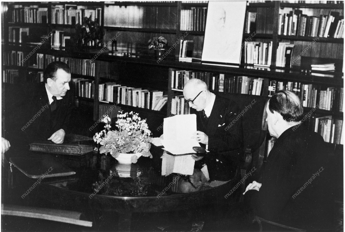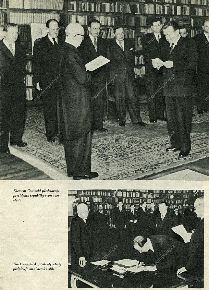 Jednání o navržené demisi nekomunistických ministrů u kulatého stolu v prezidentově kanceláři na Pražském hradu. Zleva: Edvard Beneš, Antonín Zápotocký, Klement Gottwald, Václav Nosek, MMP H 240 247; Předseda vlády Klement Gottwald a prezident Edvard Beneš po podpisu demise nekomunistických ministrů, MMP H 200 247/021.