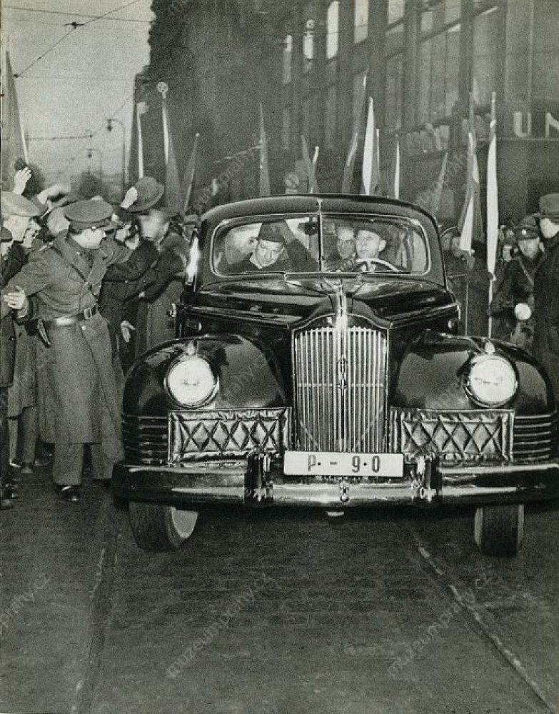 Rudé právo z 26. února 1948. Titulní strana se jmenným seznamem členů nové vlády, MMP HNS 000 103/061; Předseda vlády Klement Gottwald společně s generálním tajemníkem KSČ Rudolfem Slánským přijíždí automobilem k davu na Václavském náměstí, MMP H 044 098/034.