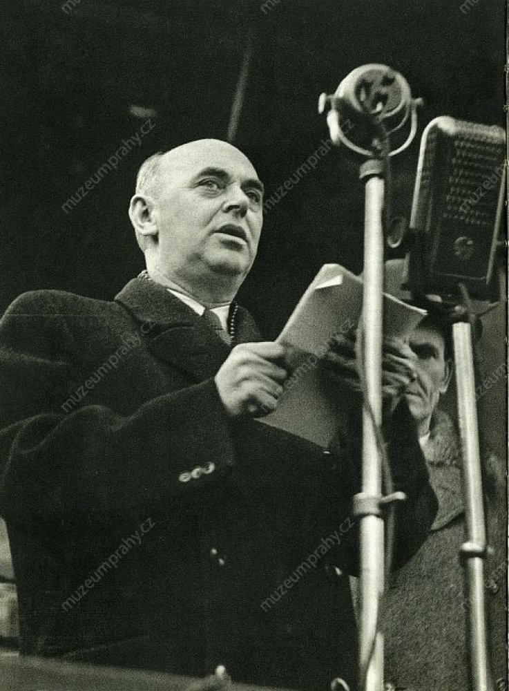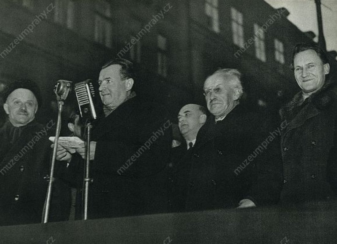 Ministr Václav Kopecký promlouvá k davu na Václavském náměstí. 25. února 1948, MMP H 044 098/032; Zdeněk Nejedlý zdraví lid na Václavském náměstí. 25. února 1948, MMP H 044 098/033.