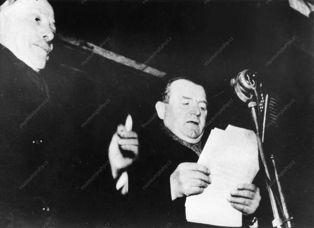 Klement Gottwald promlouvá na celostátním sjezdu závodních rad v Průmyslovém paláci. 22. února 1948. MMP H 044 098/017; Antonín Zápotocký při svém projevu na celostátním sjezdu závodních rad v Průmyslovém paláci. 22. února 1948, MMP H 044 098/016.