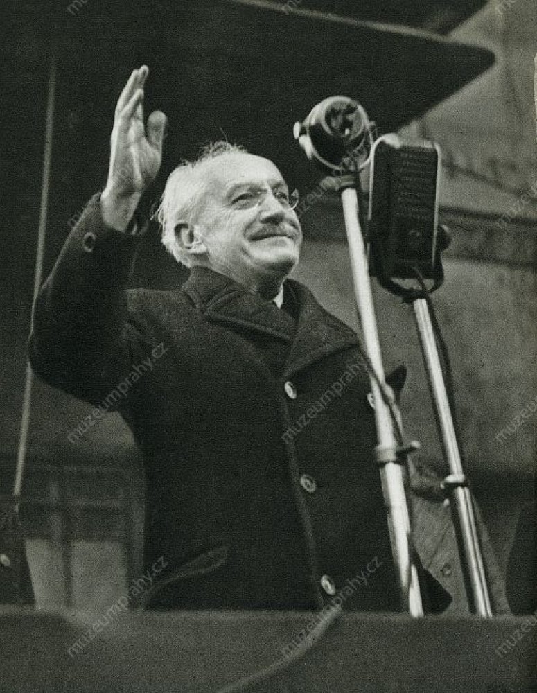 Předseda vlády Klement Gottwald oznamuje veřejnosti, že prezident Edvard Beneš přijal demisi nekomunistických prezidentů. 25 února 1948, MMP H 198 751; Předseda vlády Klement Gottwald za přítomnosti svých spolustraníků seznamuje přítomné se závěry svého setkání s prezidentem Edvardem Benešem, MMP H 044 098/035.