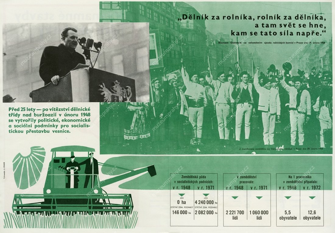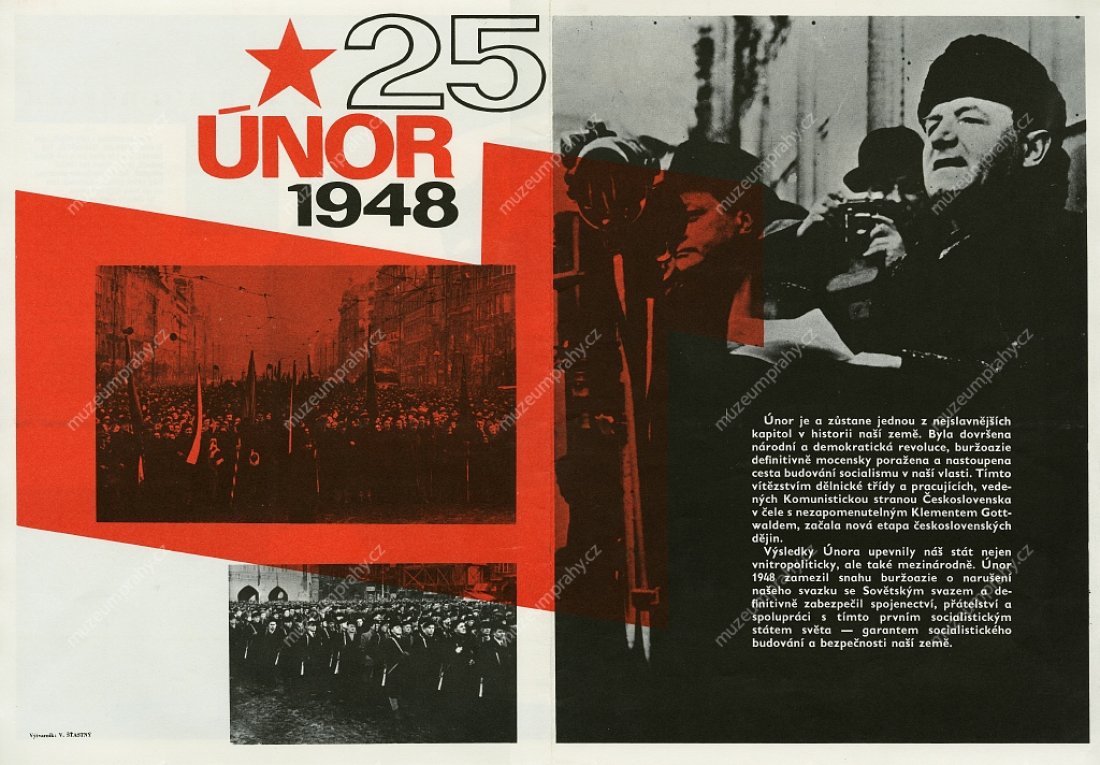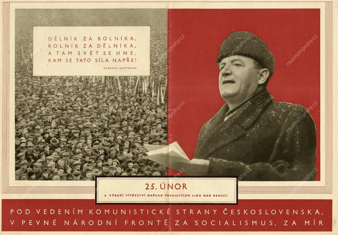 Propagační plakát vydaný pří příležitosti 6. výročí Vítězného února (1948–1954), MMP H 200 100/010; Plakát k 25. výročí Vítězného února (1948–1973) s použitím fotomontáže z projevu Klementa Gottwalda na Staroměstském náměstí v Praze 21. února 1948. Autor Fr. Kraus. Vydala Svoboda pro ÚV KSČ, 1973. Tisk SG 2, MMP H 088 949.