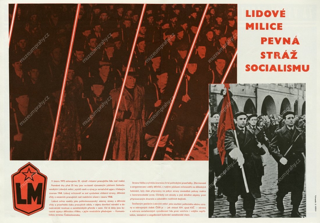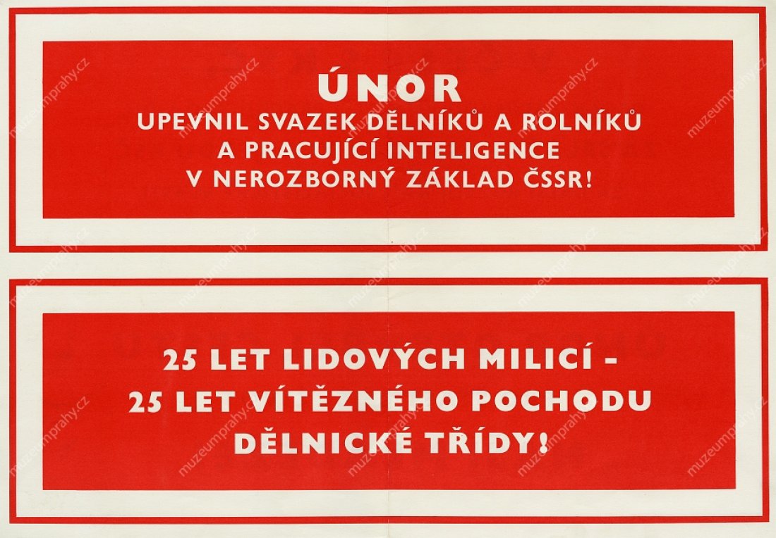 Plakát k 25. výročí Vítězného února (1948–1973). Autor J. Lidral. Vydala Svoboda pro ÚV NF ČSSR. Tisk SG 2, MMP H 088 946; Plakát k 25. výročí Vítězného února (1948–1973). Propagace činnosti Lidových milicí. Heslo: Lidové milice – pevná stráž socialismu. Autor: Z. Filip, MMP H 091 120/011.