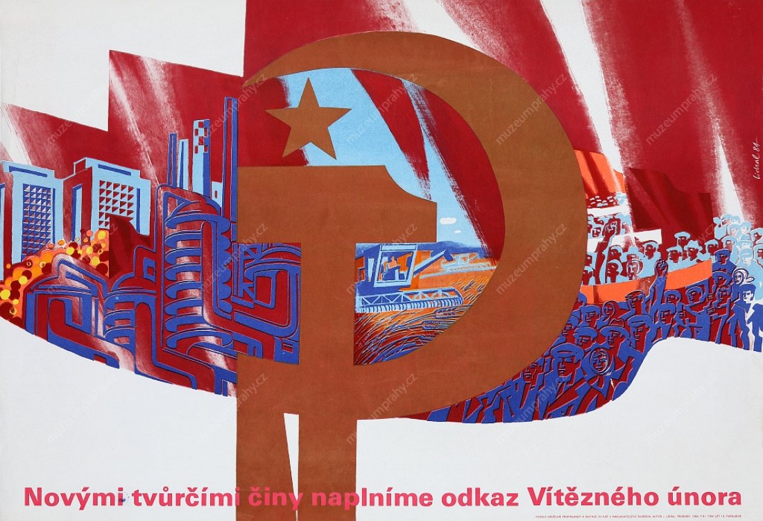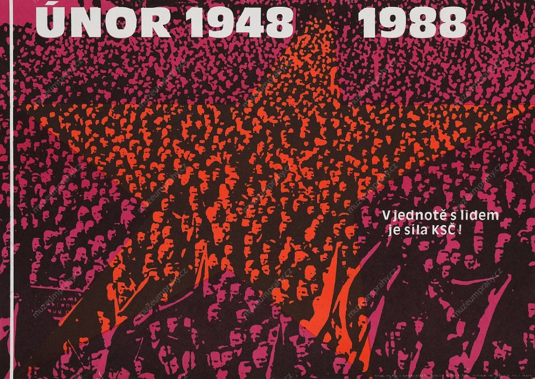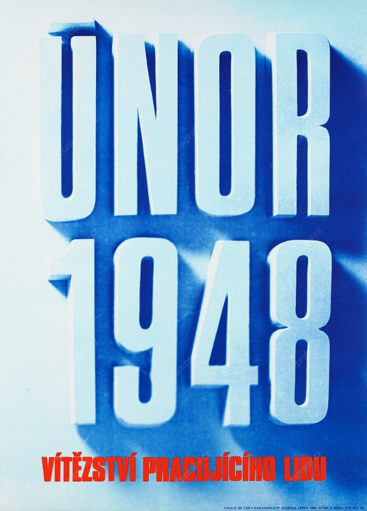 Plakát k 34. výročí Vítězného února 1948. Autor: K. Míšek. Vydalo MK ČSR v nakl. Svoboda. Tisk MTZ 30, MMP H 118 497; Plakát k 40. výročí Vítězného února (1948–1988) s nápisem V čele s KSČ za socialismus a mír. Autor: R. Werner, vyd. Oddělení propagandy a agitace ÚV KSČ, tisk JČT 1, MMP H 139 151.