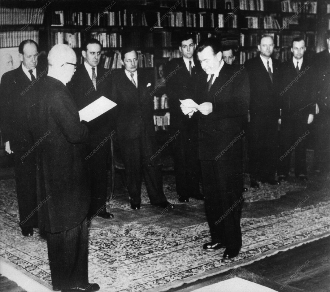 Členové nově složené Gottwaldovy vlády skládají slib u prezidenta E. Beneše. 27. února 1948, MMP H 198 585/001.
