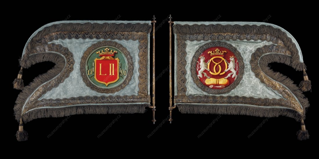 Korouhev cechu pekařů, Praha 1791, hedvábný damašek, olejomalba, železná konstrukce. Na jedné straně korouhve iniciály Leopolda II., na druhé straně na červeném pozadí znak pekařů – dvojice lvů držících preclík a žemli, MMP H 034 501 (HD 000 853).