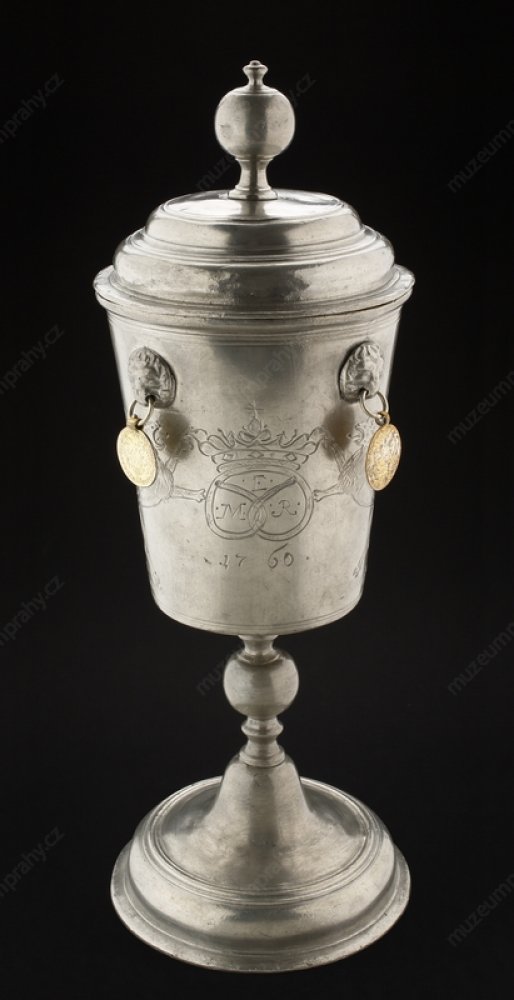Slavnostní nádobí cechu pekařů. Vlevo Koflík pekařských tovaryšů, Praha, 1818, sign. František Rixy, cín, odlévání, gravírování, MMP H 034 539. Ve středu Holba cechu pekařů, Čechy, 1. polovina 19. století, sklo přejímané, ryté a broušené, MMP H 017 100. Vpravo Vilkum cechu pekařů, Čechy, 1760, doplněno 1848, cín, odlévání, gravírování, mosaz, zlacení, MMP H 016 019.
