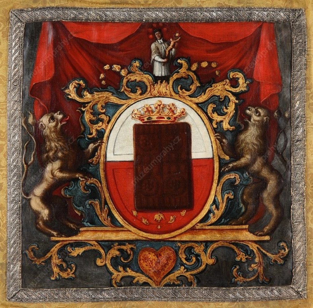 Detail korouhve cechu perníkářů, Praha 1791, hedvábný damašek, olejomalba, železná konstrukce. Na štítu lvi držící kartuš se symbolem perníku, na jejím vrcholu postava sv. Jana Nepomuckého, MMP HD 000 797.